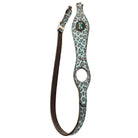 Cheetah turquoise suede print gun sling with thumb hole, chocolate chap liner and antique silver berry concho.