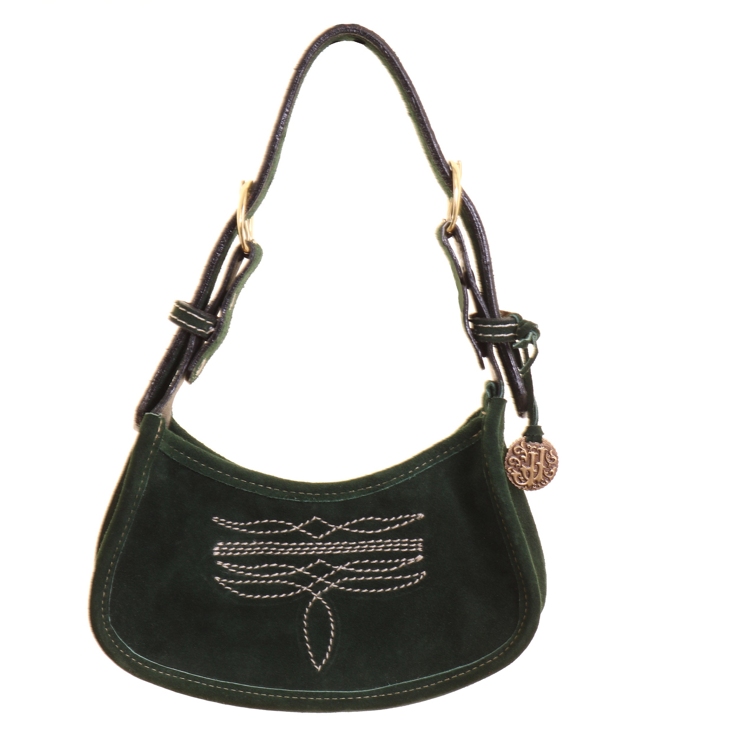 Double J Purse in Forest Green Suede with Cream Boot Stitching on Front & Back.