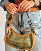 Double J Purse with turquoise and metallic gold leather body, with adjustable leather strap with gold-tone hardware