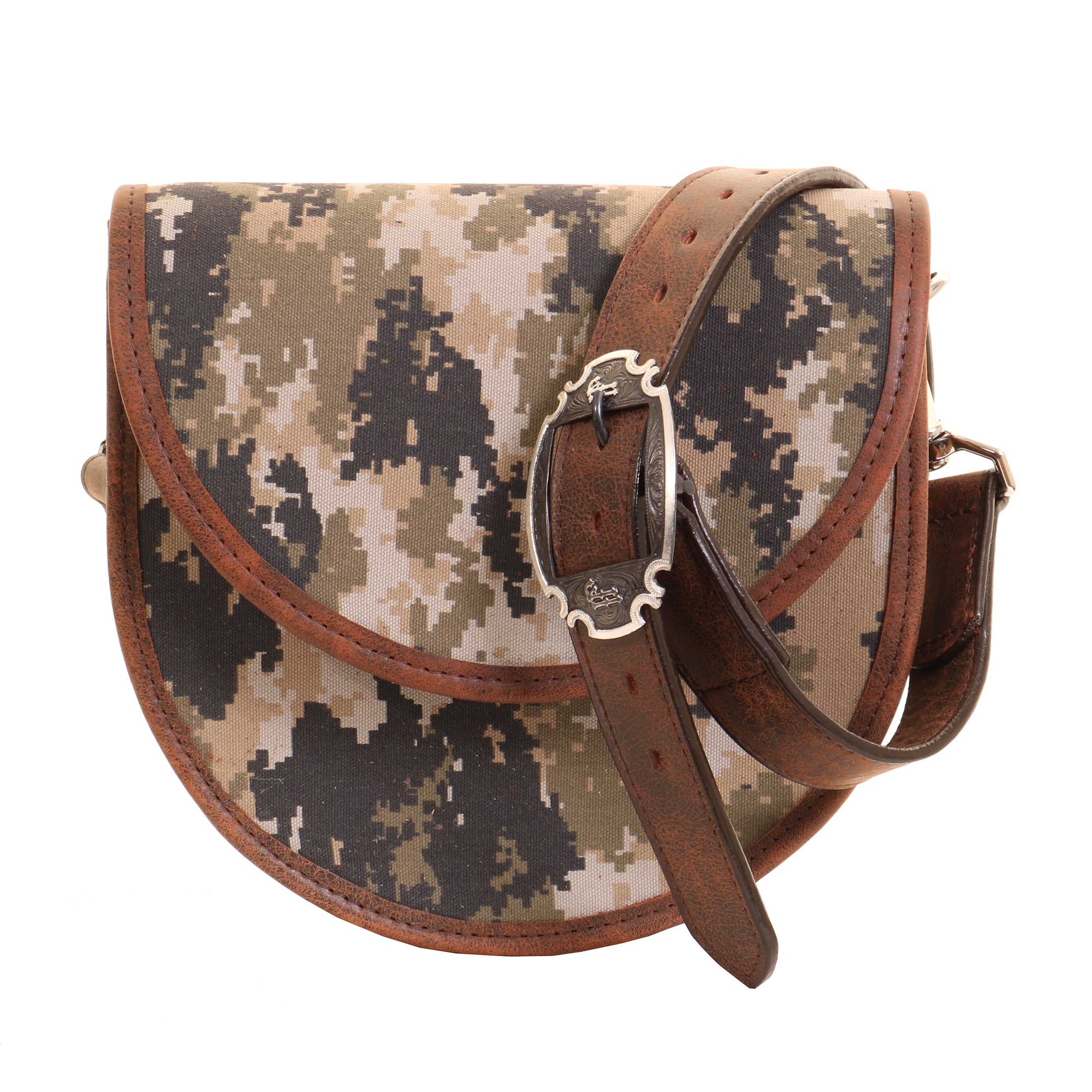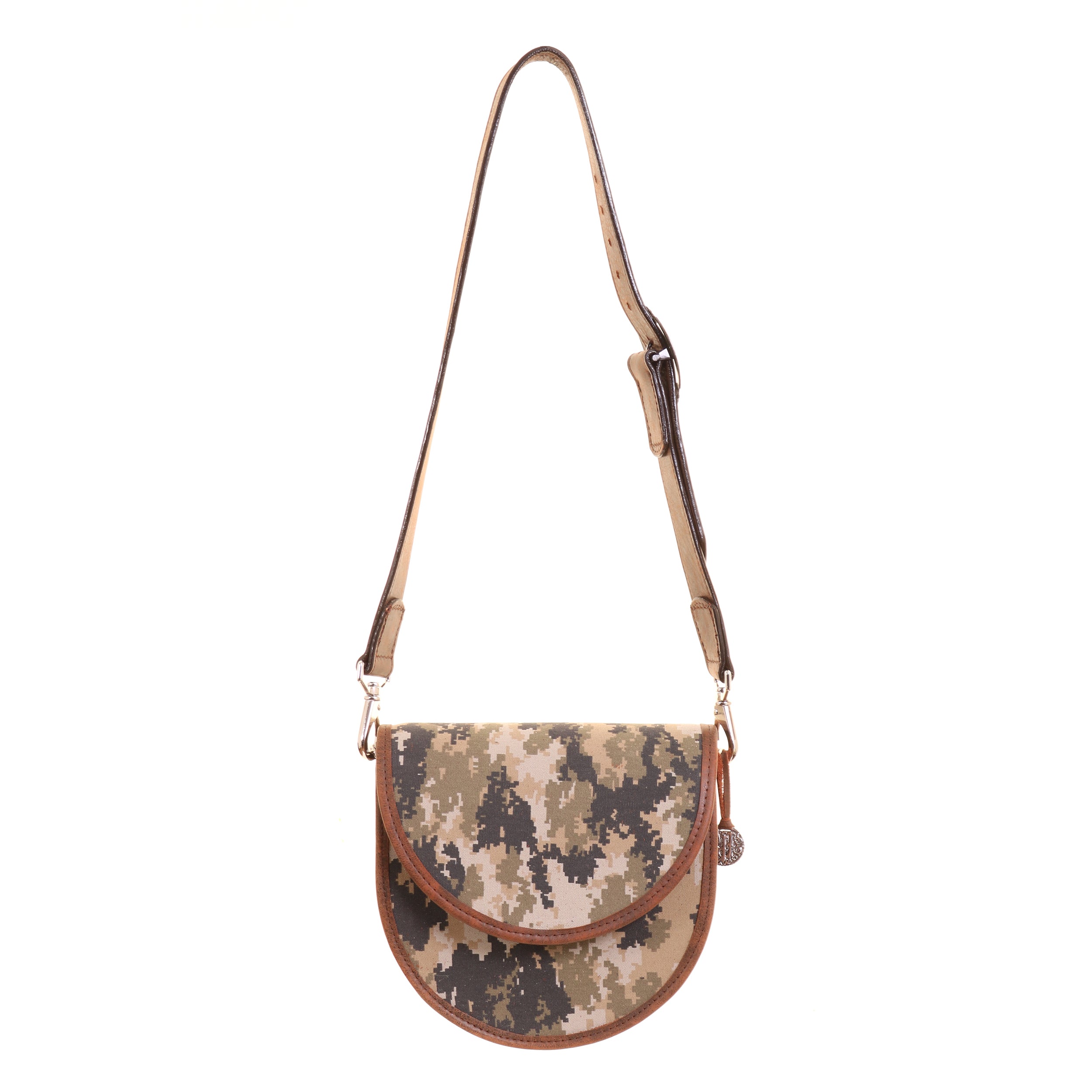 Saddle bag in camo canvas with brown bomber trim, gusset & long adjustable strap.