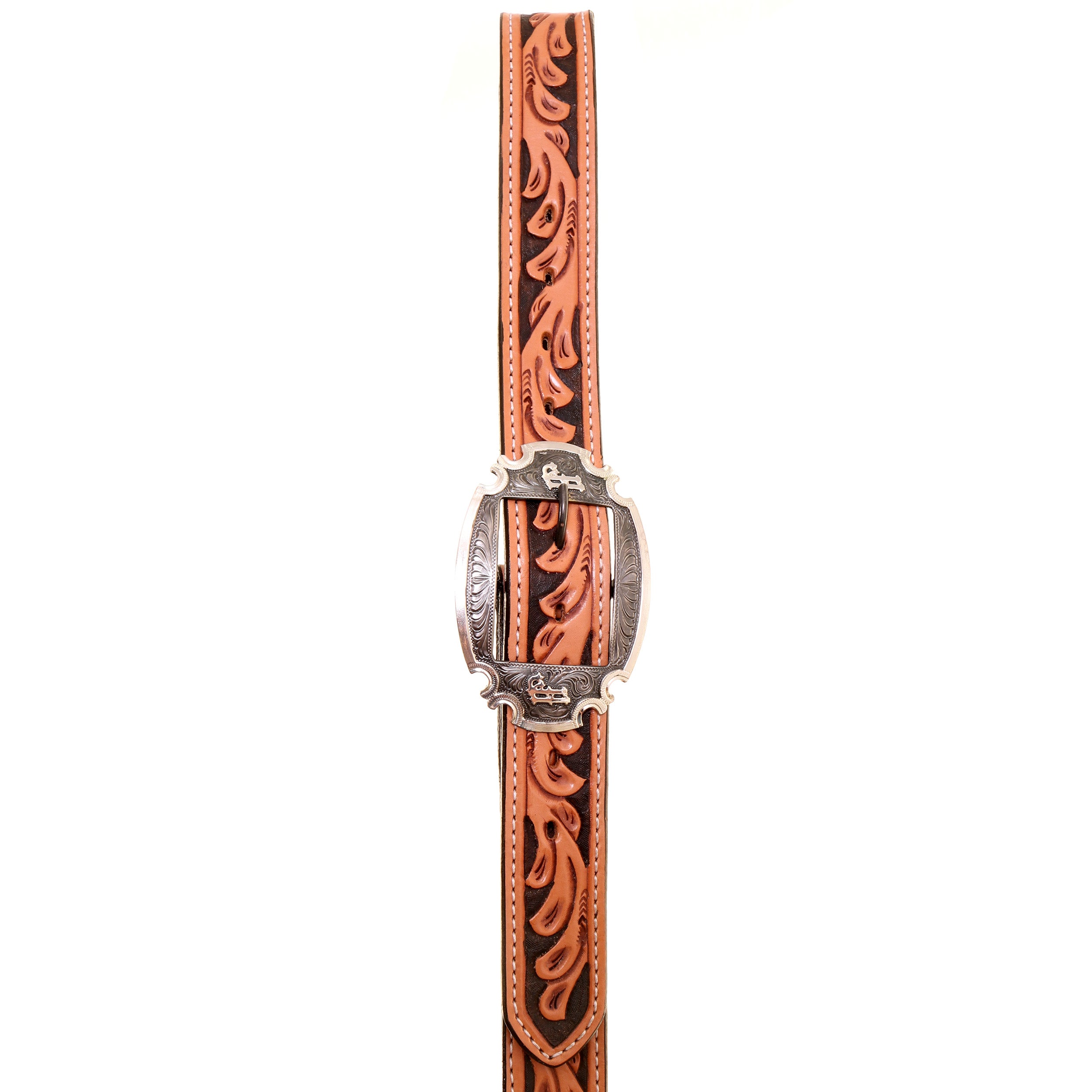 Sheridan Tooled Small Square Tote in Natural Leather with a Chocolate background.  Double Handles and a adjustable long strap with our beautiful JJ buckle. Stitched in white stitching.