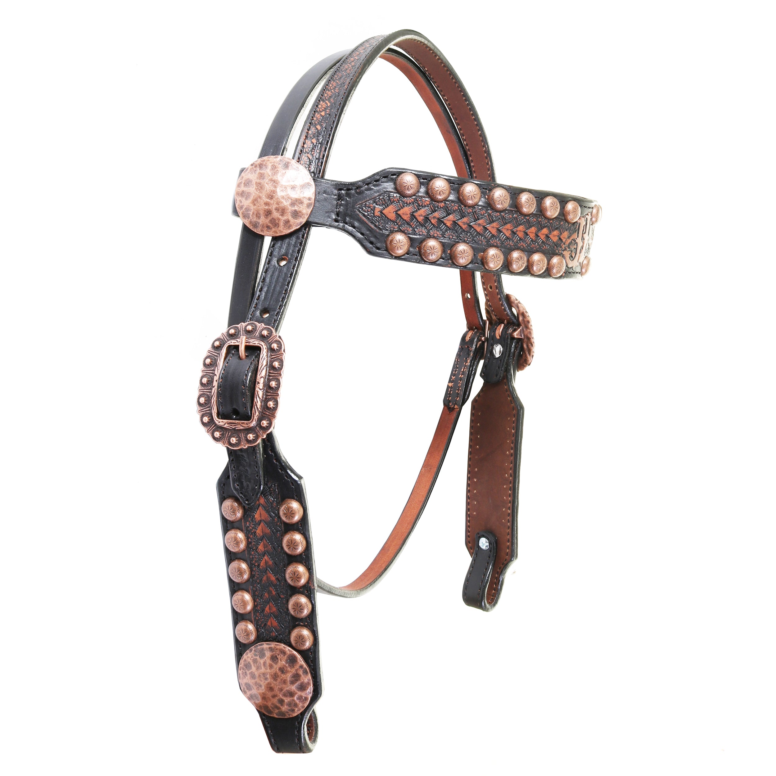 Chestnut Black Vintage headstall with arrow basketweave tooling, painted JJ's on browband, antique copper berry buckles, antique copper engraved dots, and copper hammered conchos.