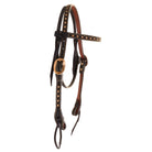 Black roughout browband with gold buckstitch, gold thread, antique brass buckles, and laces at bit ends and brow.