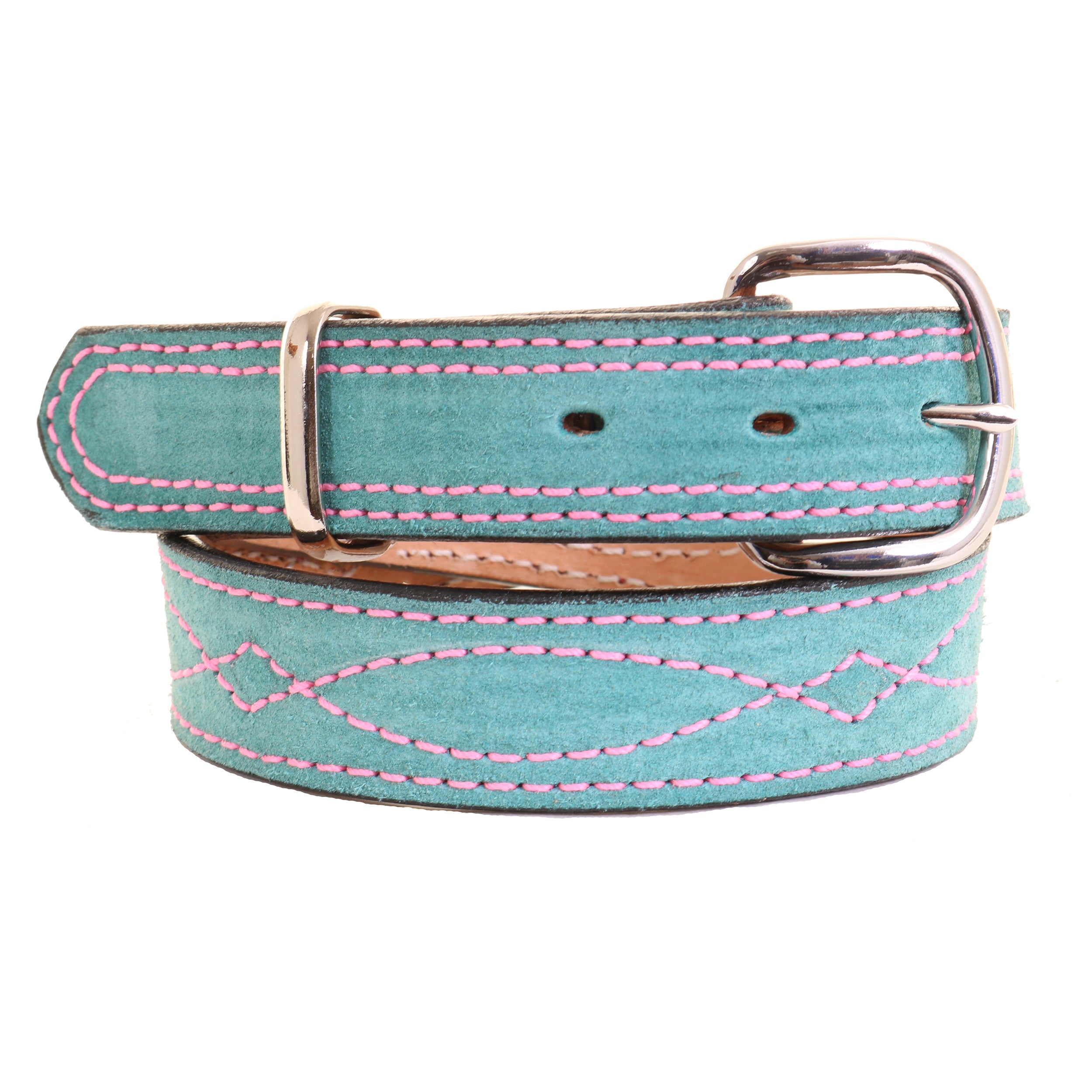 1 3/8" Premium Turquoise suede leather lined in Herman Oak saddle skirting leather, stitched in pink thread with our classic Gunslinger pattern!