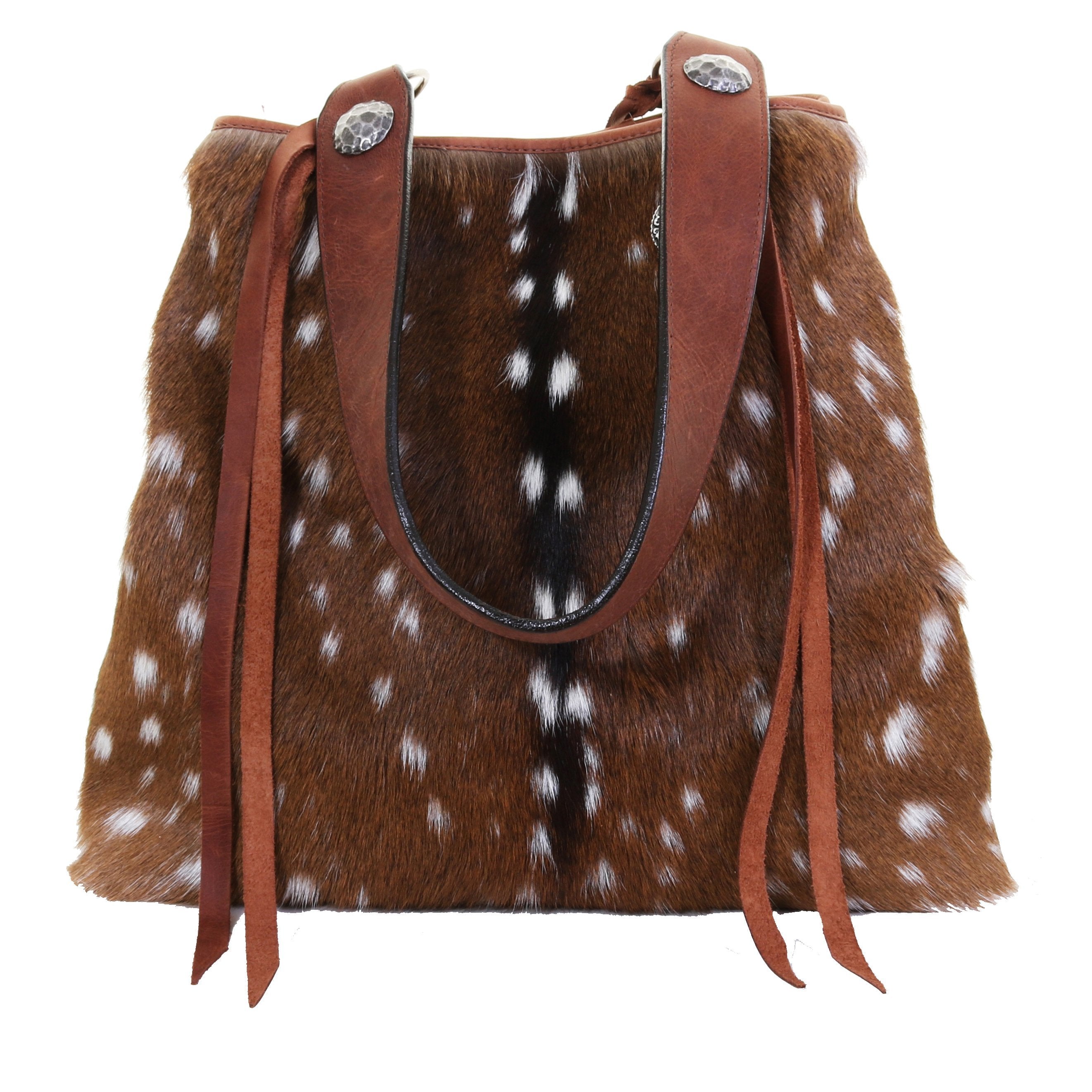 Axis hair big tote with brandy pull-up trim, back, strap and saddle strings. Hammered antique silver conchos and silver hardware. Features include an inside zipper pocket, magnetic closure on sides and center top opening. Hair colors may vary.