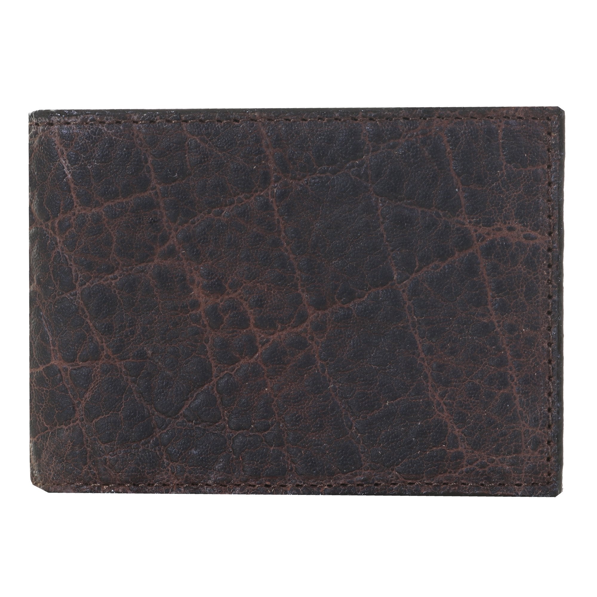 Bifold wallet in espresso elephant print leather on both sides. Includes double sided picture window for driver's license or other I.D, 6 slots for credit cards, etc., 2 long dividers for cash, etc.