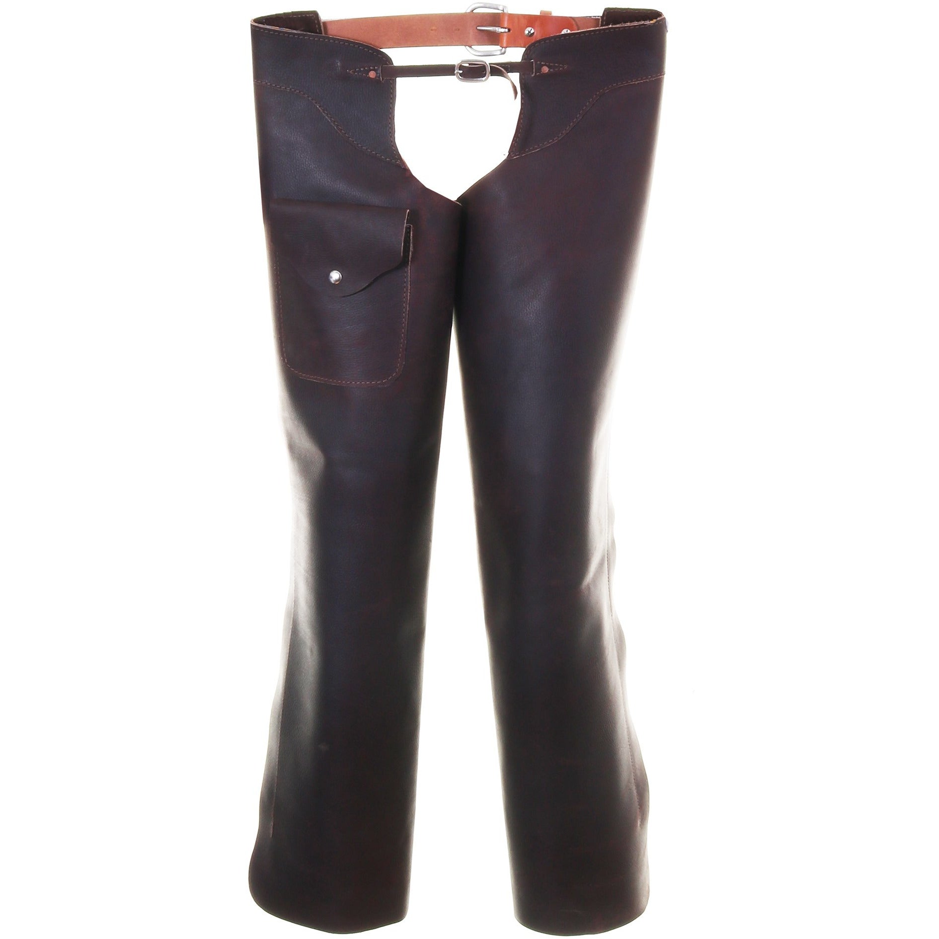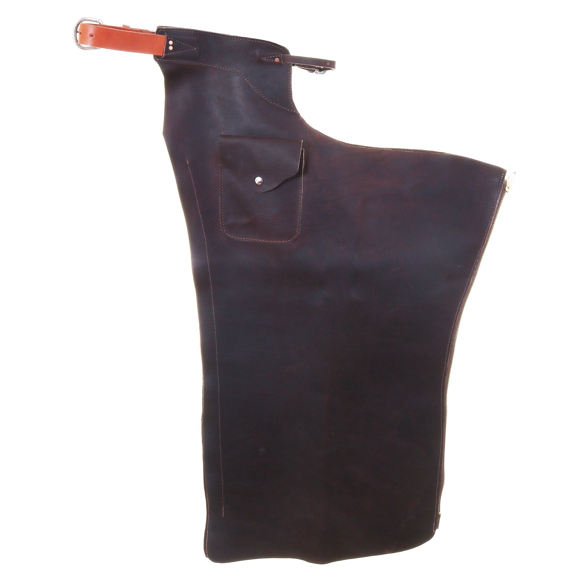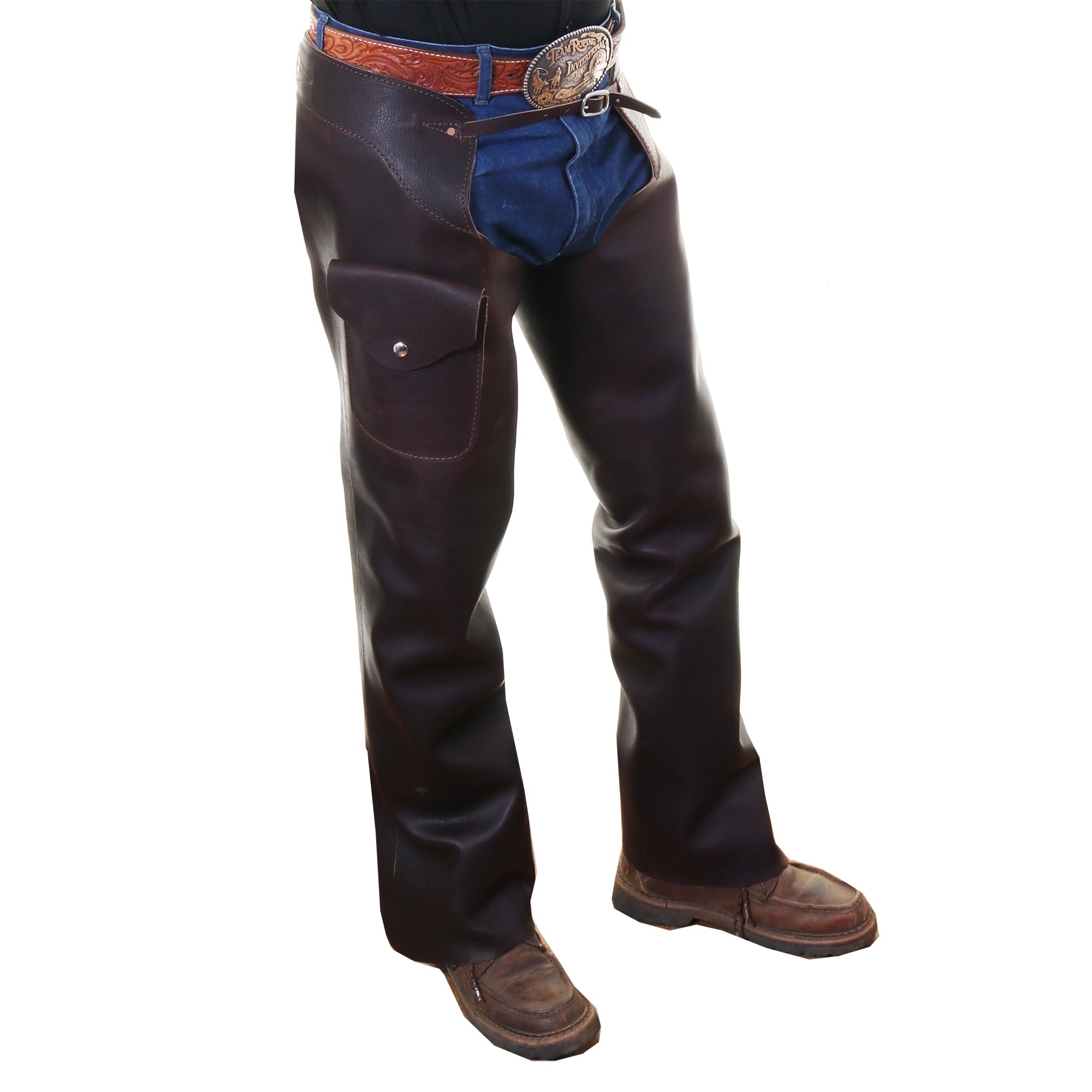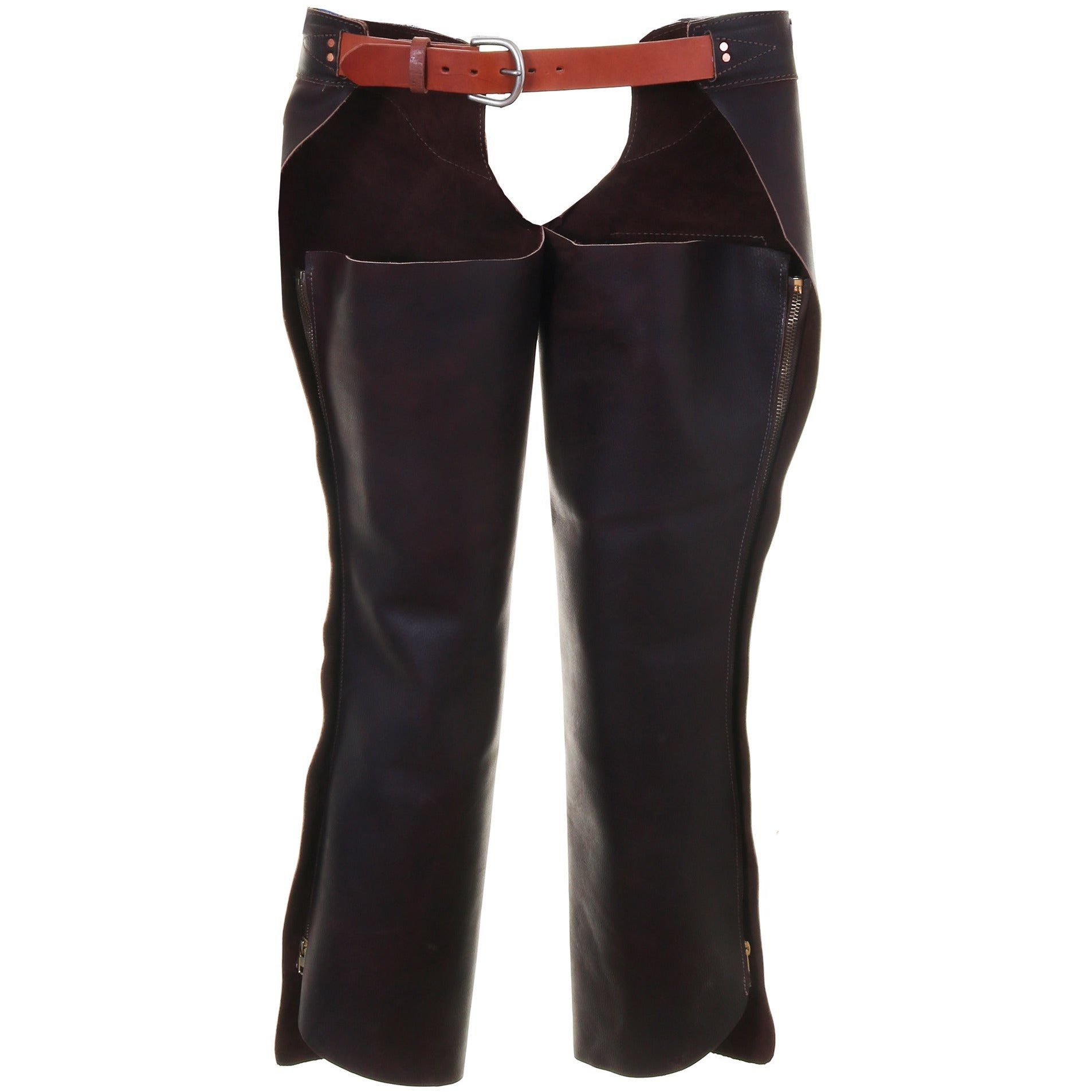 Shotgun Style Chaps with zippers. In stock chaps come with a standard 34" inseam and adjustable 40-44 size belt. Custom sizes can be ordered.