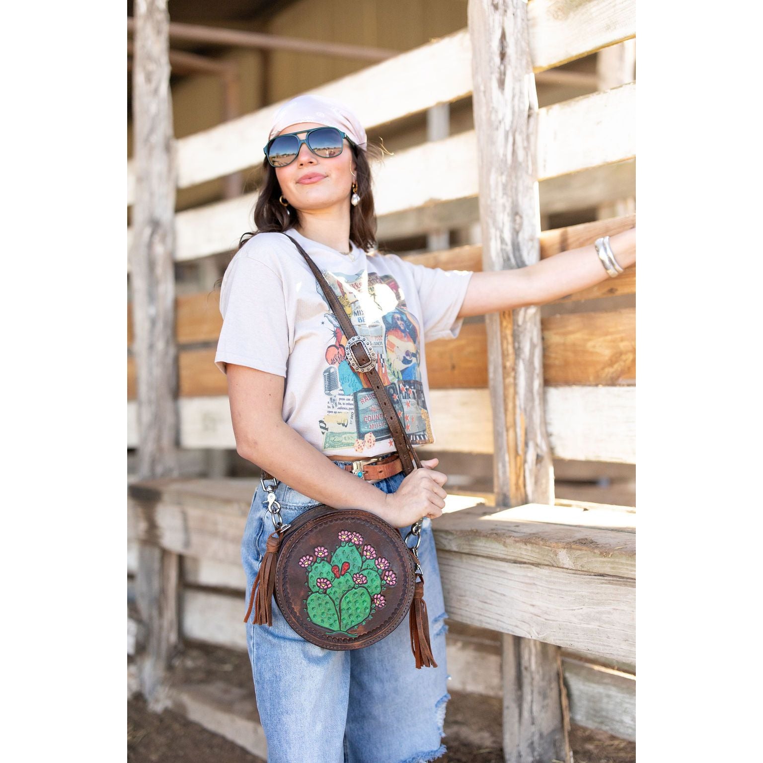 Brown vintage circle tote with hand tooled and painted prickly pear design. Ric rac tooling border along edges. Double J logo on back, brown bomber gusset with zipper and matching tassels on each side. Swivel snap detachable 3/4" wide adjustable strap with antique silver berry buckle and antique silver hammered conchos.