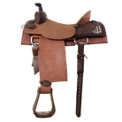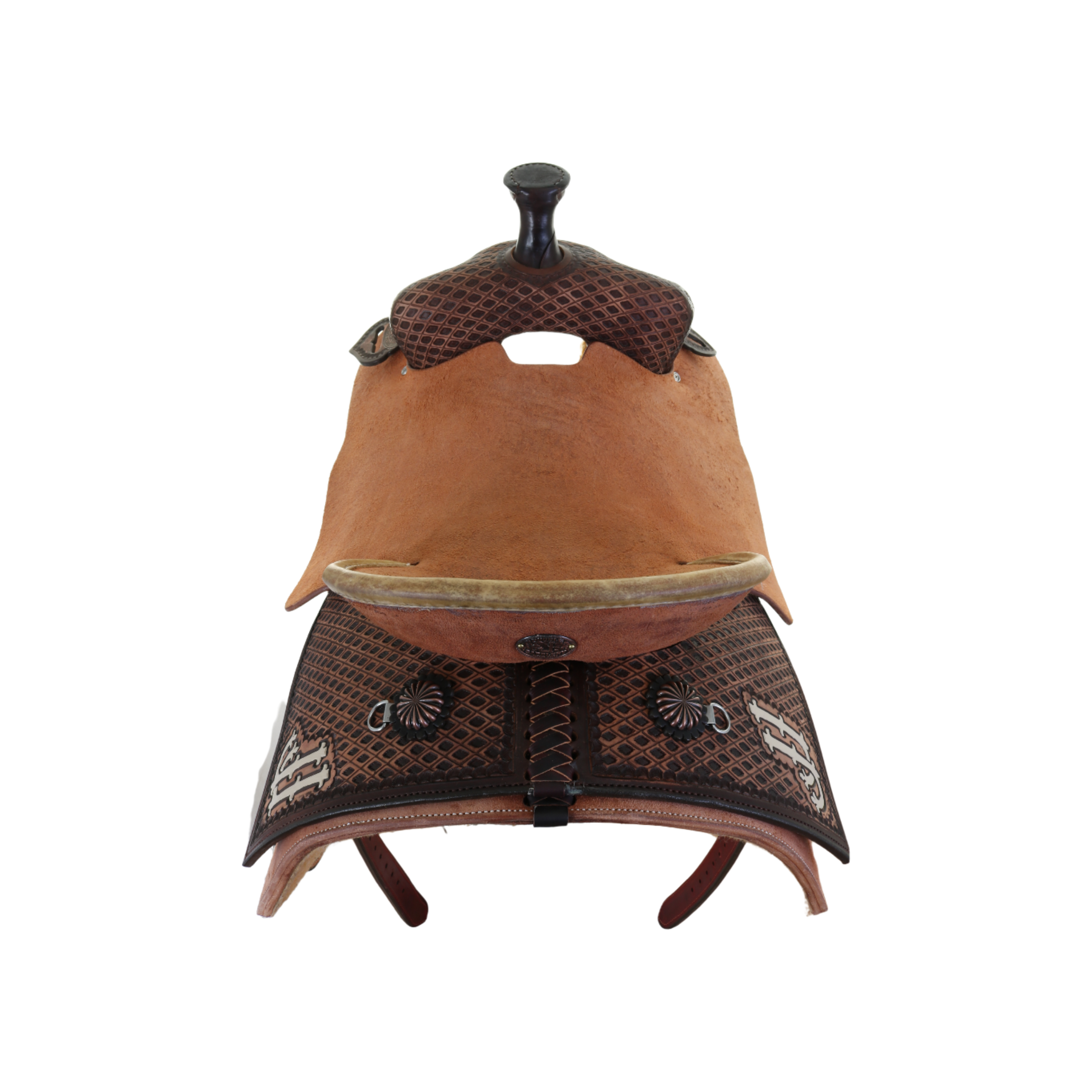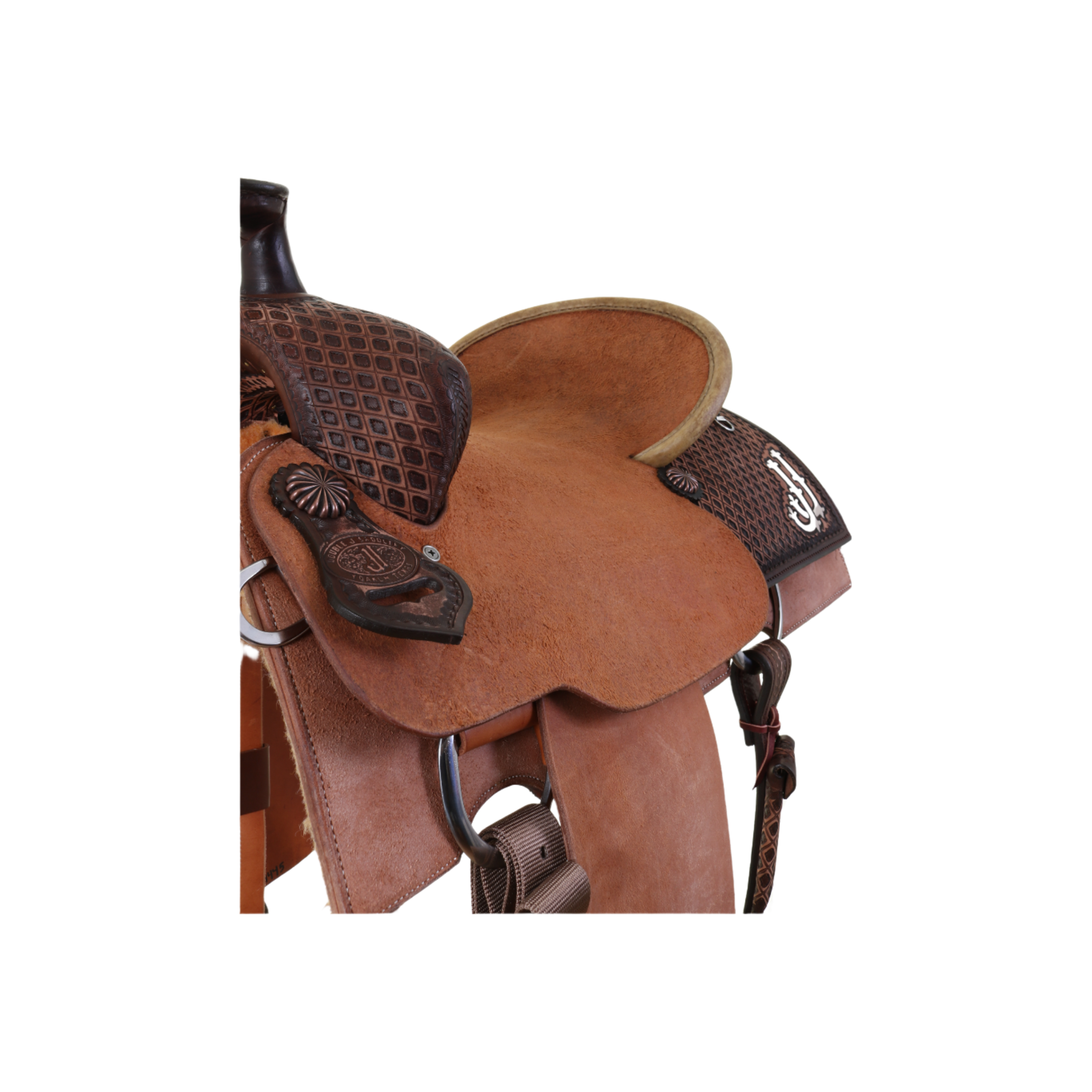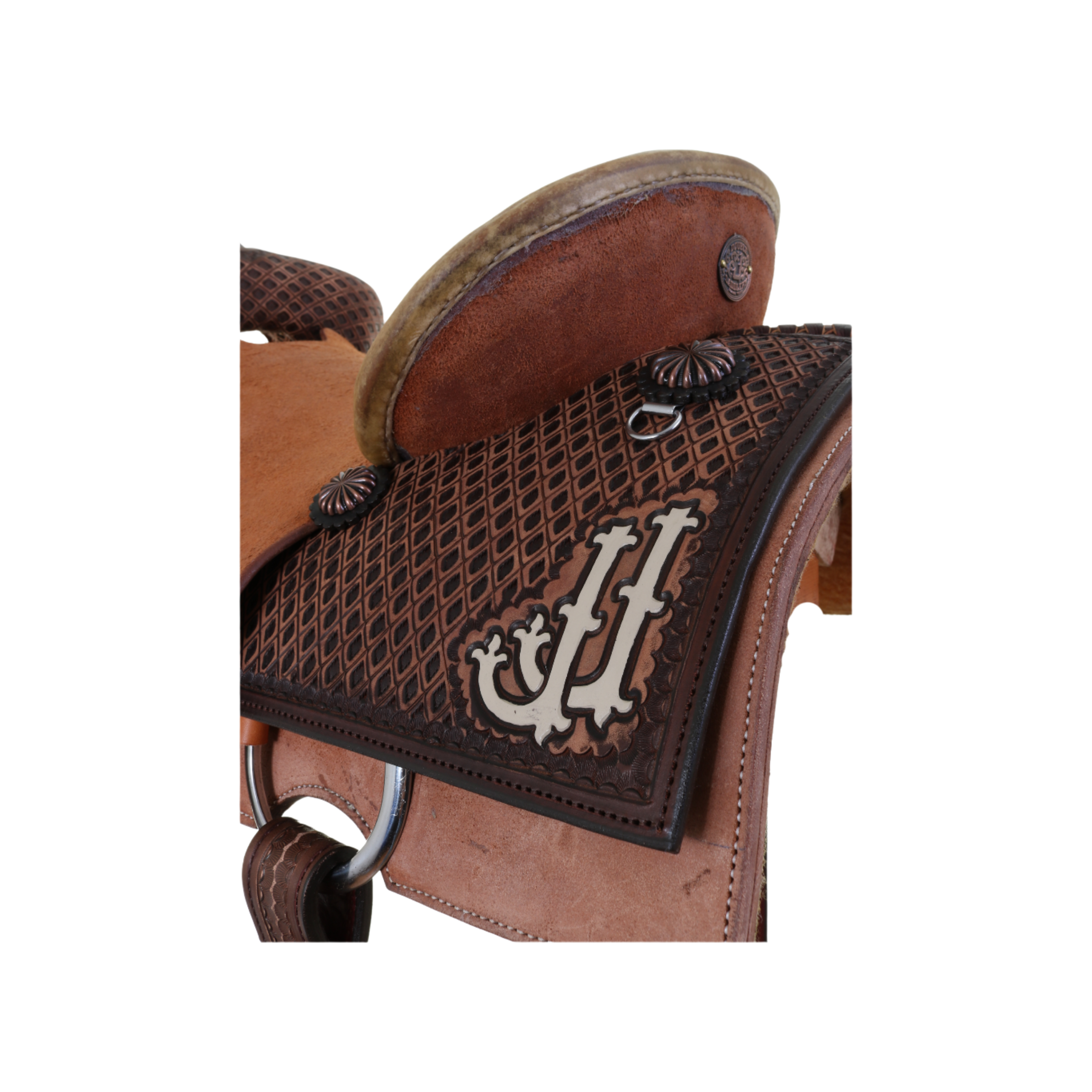 Team Roper Saddle - 1/4 Tooled Leather: Brown Vintage with Natural Roughout Parts Patterns: 90* Tooling Pattern: Southwest Diamond Horn: Brown Leather Front: Tooled Cantle: Pencil Roll with Natural Rawhide Binder Jockey: Natural Roughout Fender: Natural Roughout Stirrup: Rawhide Overshoe Roper Seat & Color: Natural Roughout Hardseat Rear Jockey: Tooled with Cream JJ's Skirt: Natural Roughout - Fleece Lined Rigging: Double Dee Conchos: C990AC Copper Parachute Trim: Brown Vintage Catchers, Hobbles, & Rosettes