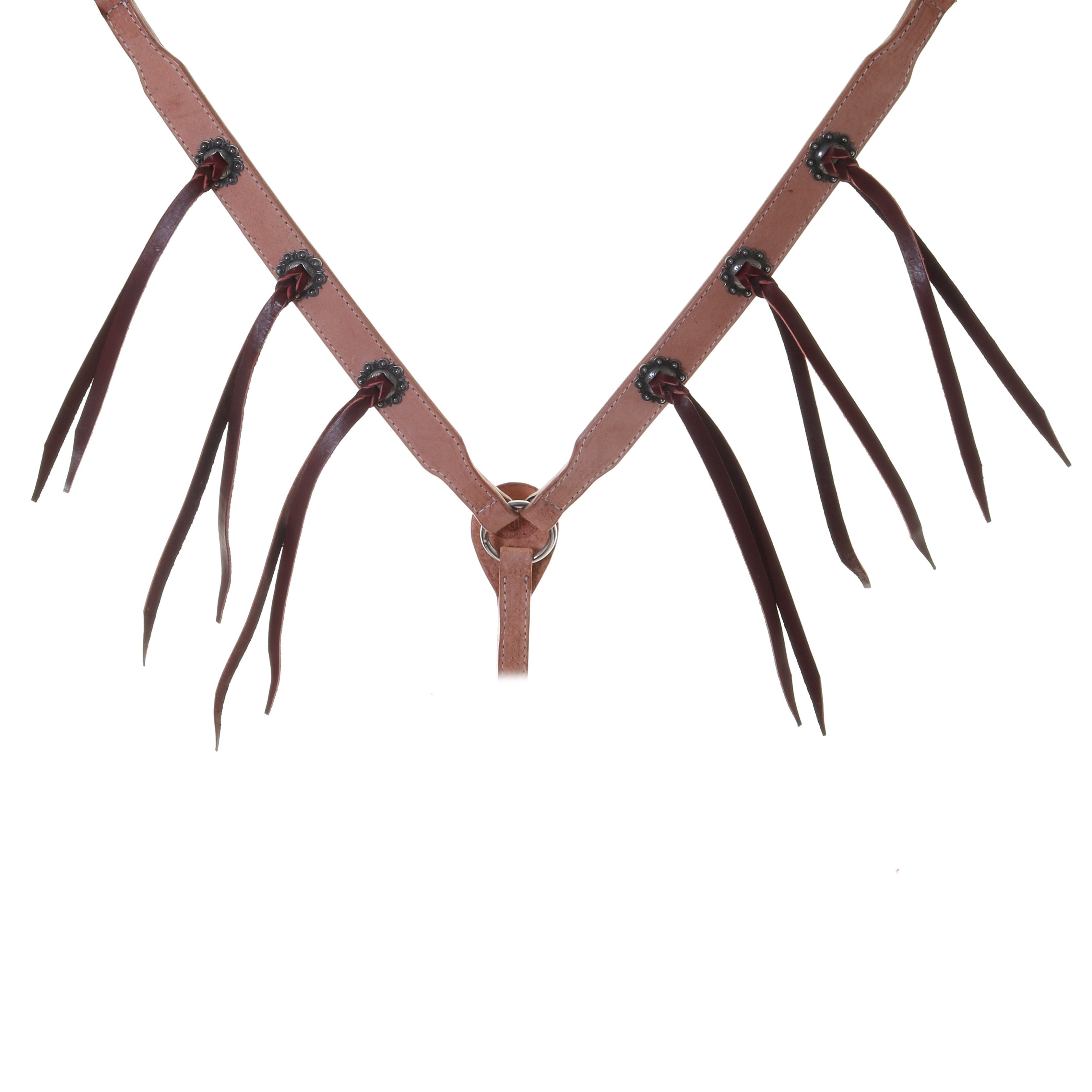 Natural rough out breast collar with no stain, rub only. White stitching and antique silver berry slotted conchos on each side with laces.