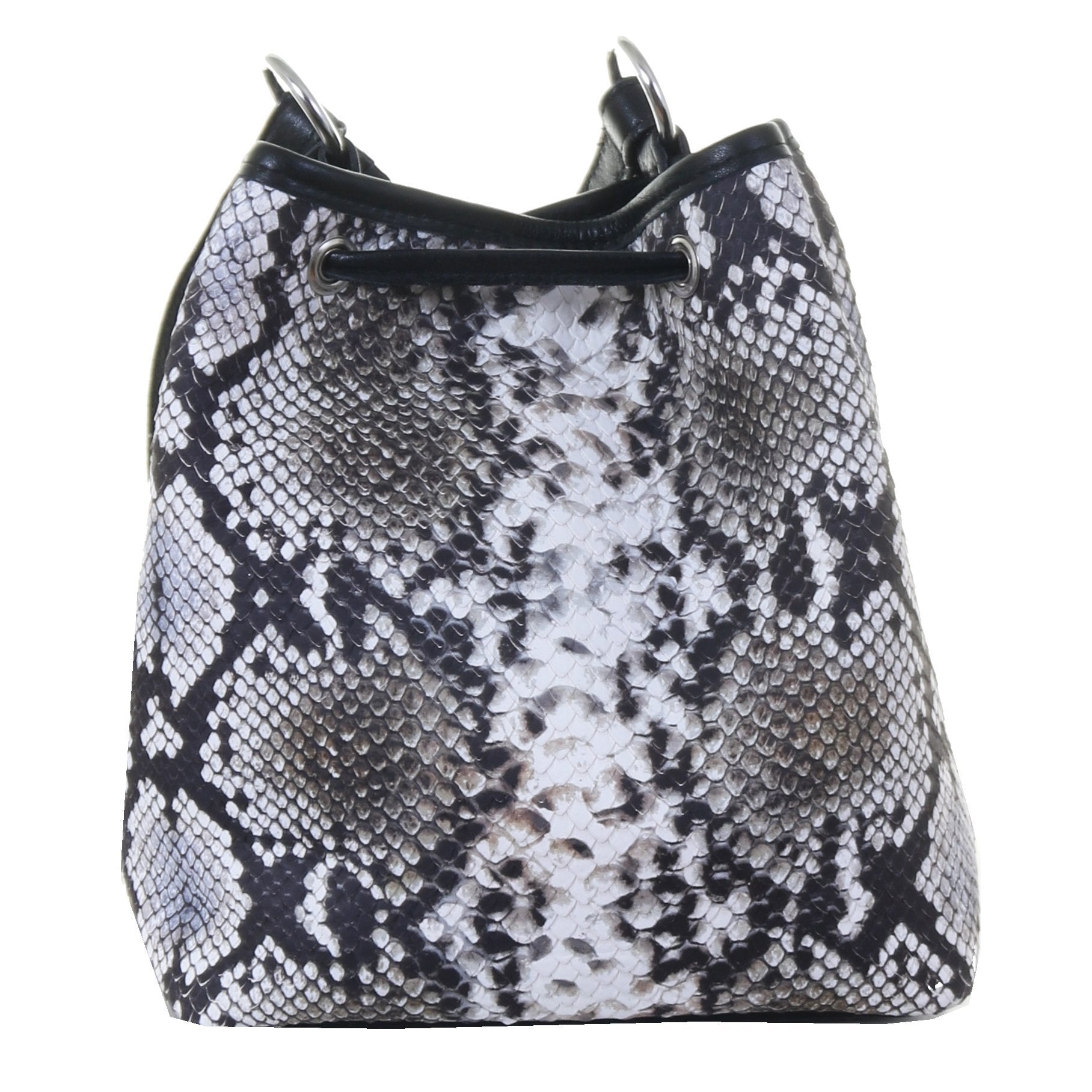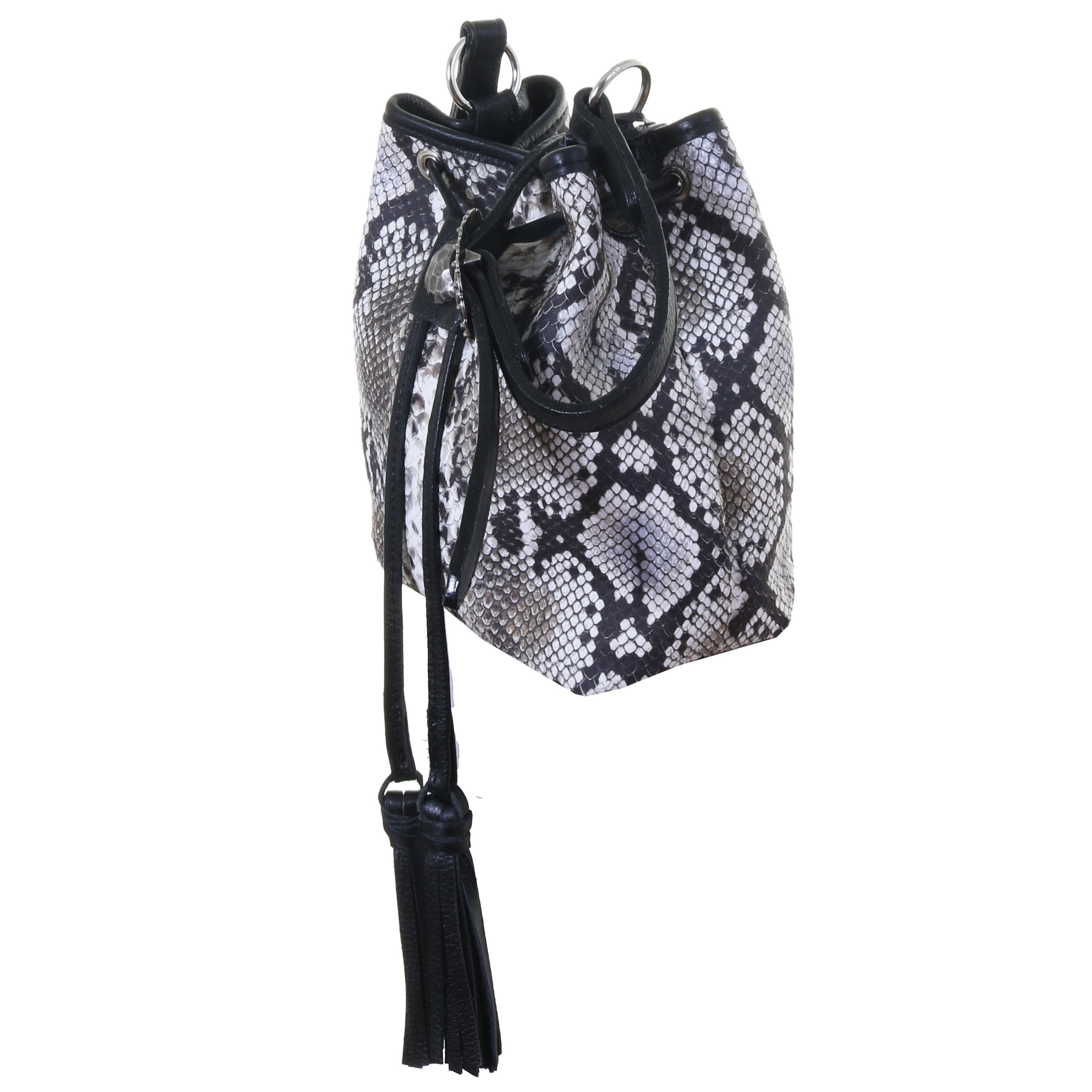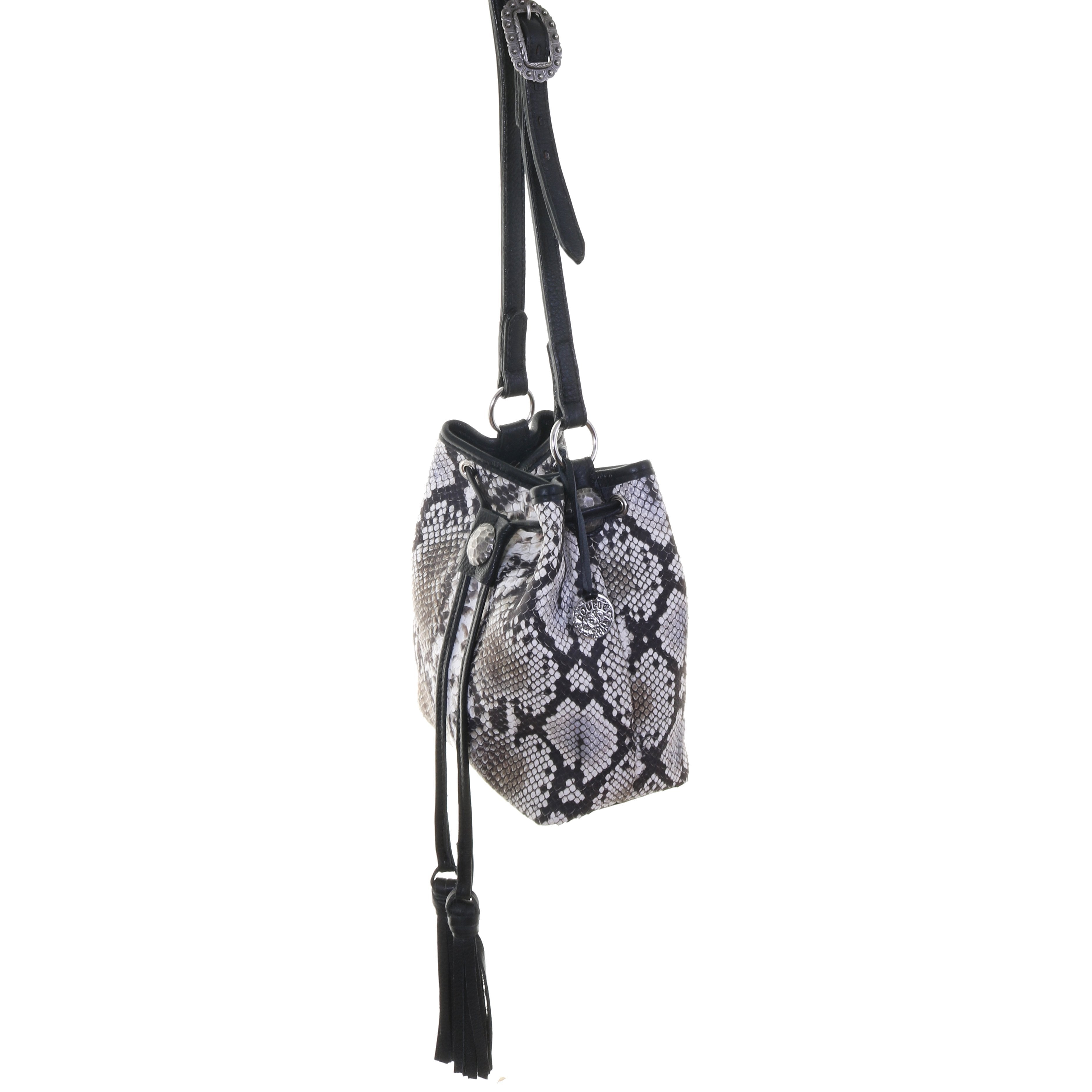 Drawstring pouch purse in cobra snake print on front and back. Black chap trim, drawstring and tassels. Accented with antique silver hammered concho on drawstring and side tabs. A 3/4" long adjustable swivel snap strap with antique silver berry buckle. Magnetic snap closure.
