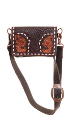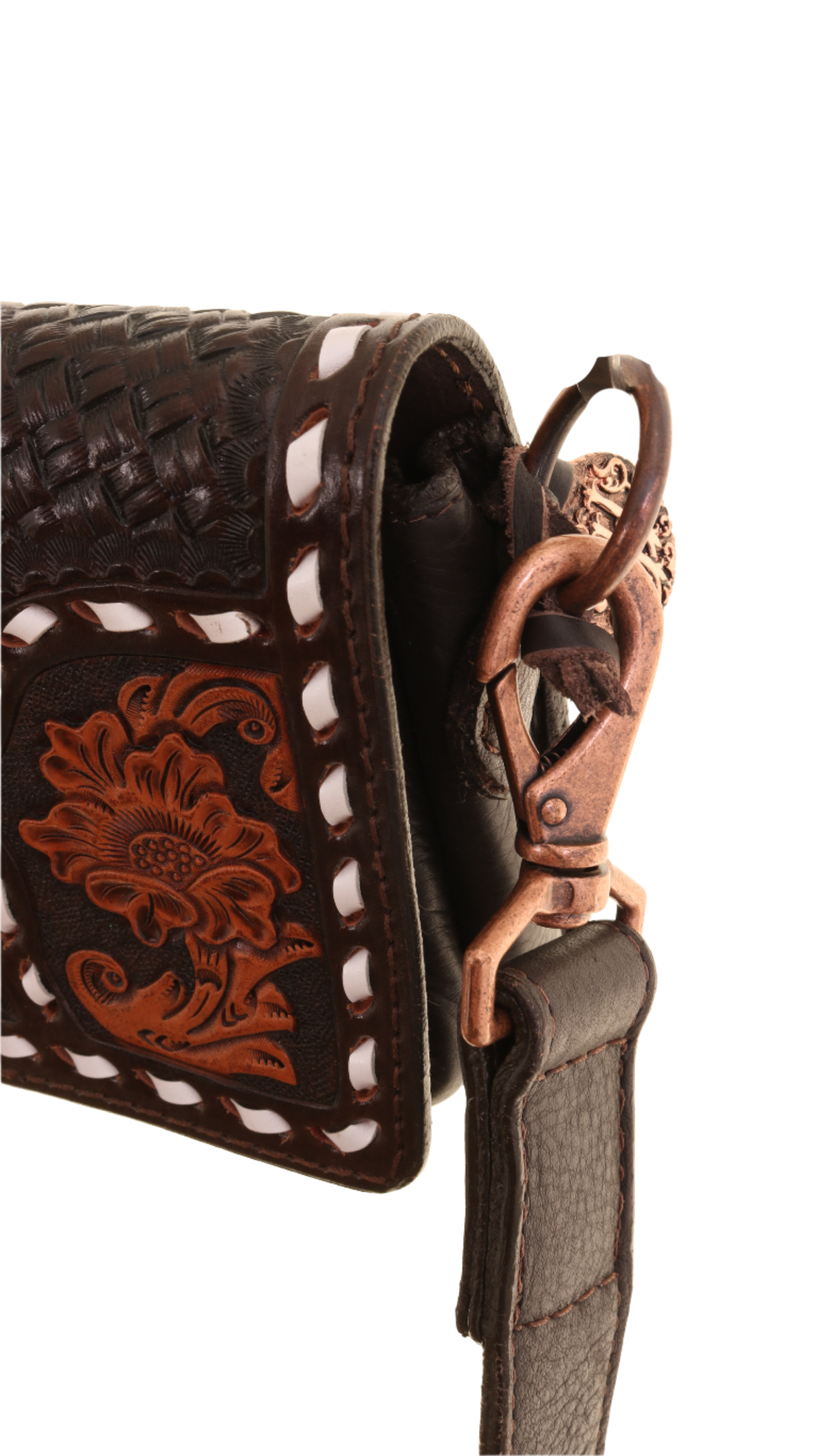 Dark chocolate hues with stand out natural leather tooling and white buck stitching make this bag a true statement piece. Elegant western style at its finest make up this super versatile bag. Wear as a sling / crossbody or belt bag / fanny pack style. Live hands free and be ready for wherever life takes you.