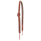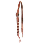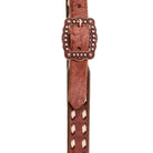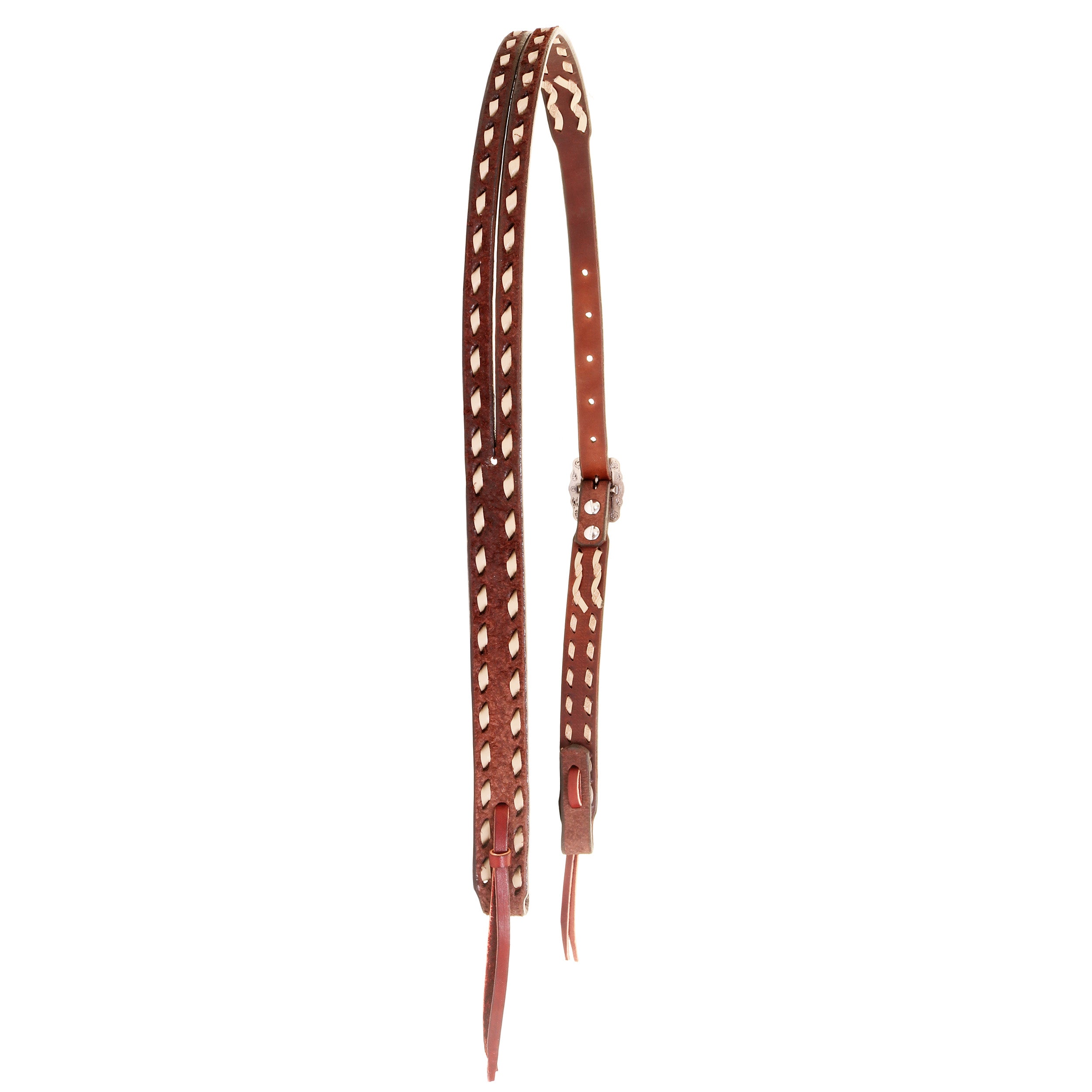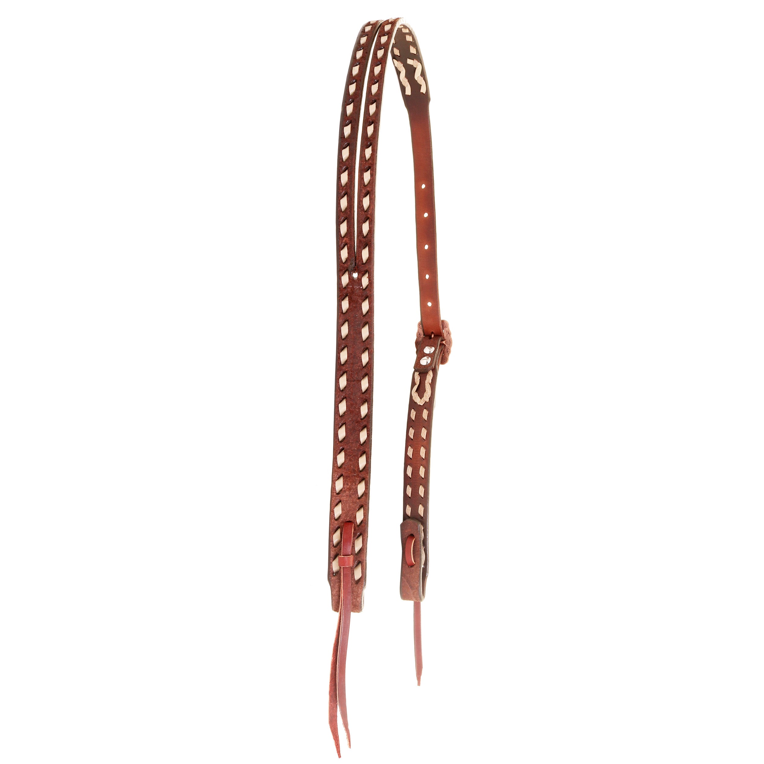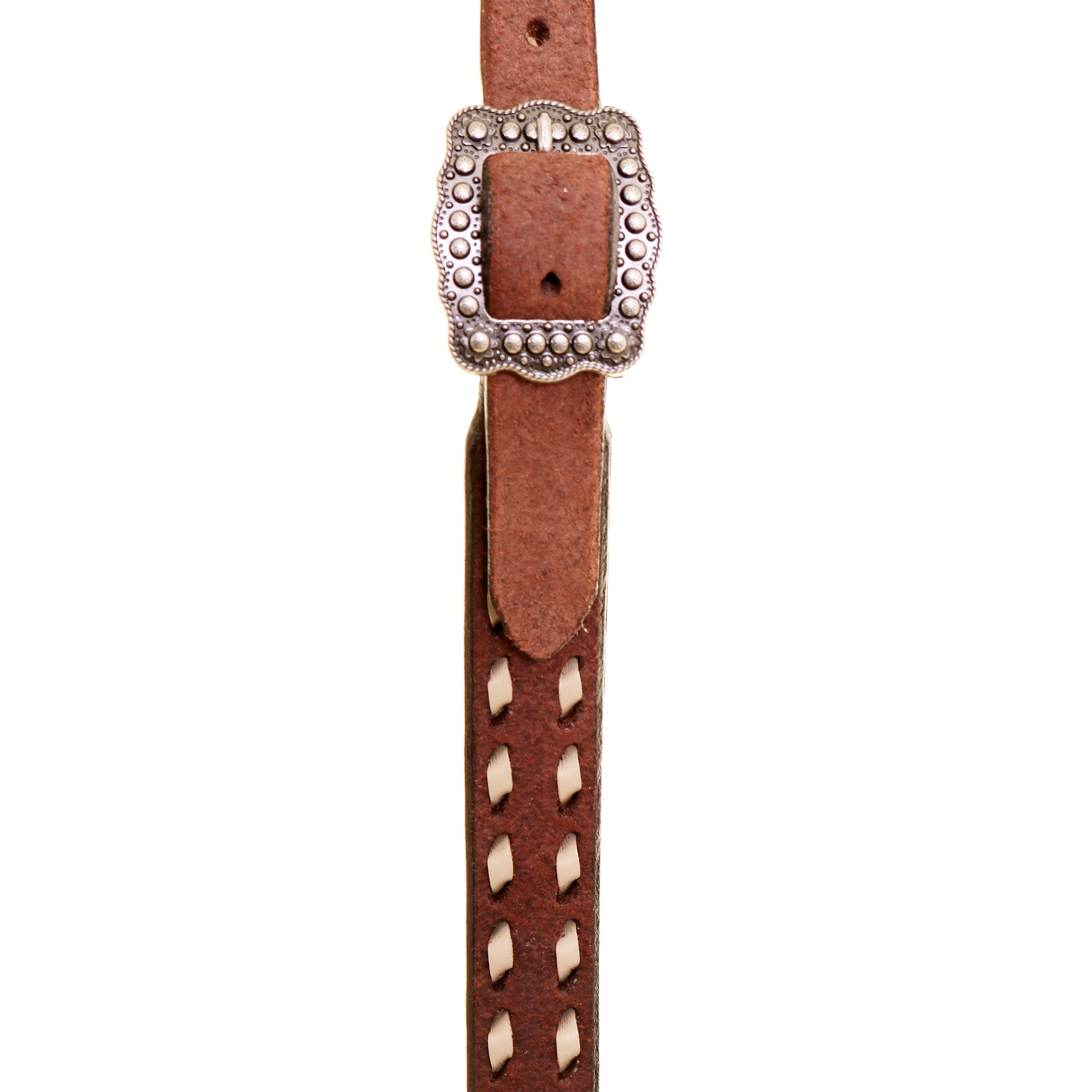 Brown roughout buckstitch split ear headstall with cream buckstitch, laces at bit ends, and choice of antique copper or antique silver berry buckles
