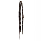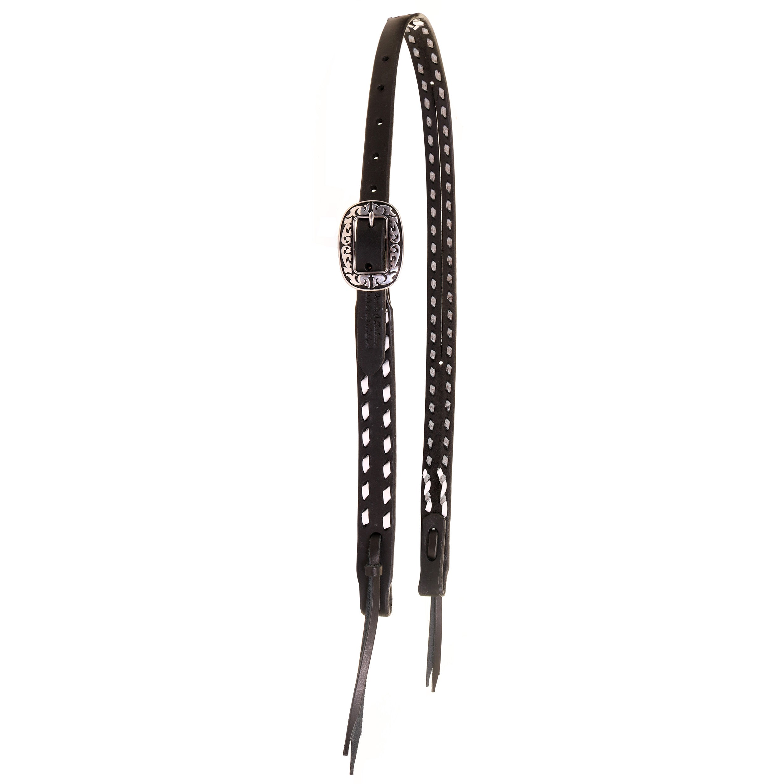 Black harness leather split ear headstall with white buckstitch, silver and black horse shoe buckle, and black laces a bit ends.