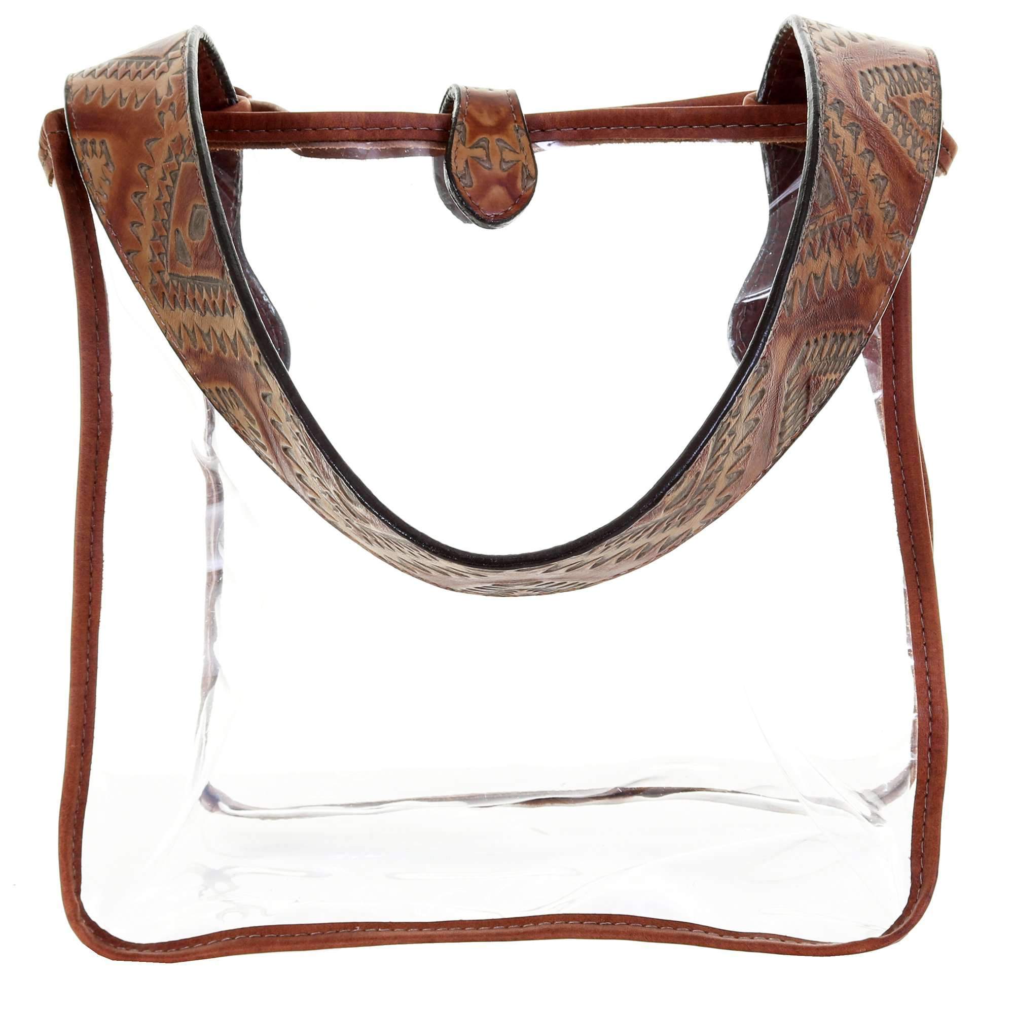 Stadium friendly clear square tote with aztec burnt strap and tab as well as brandy pull-up trim. Magnetic snap closure on tab.