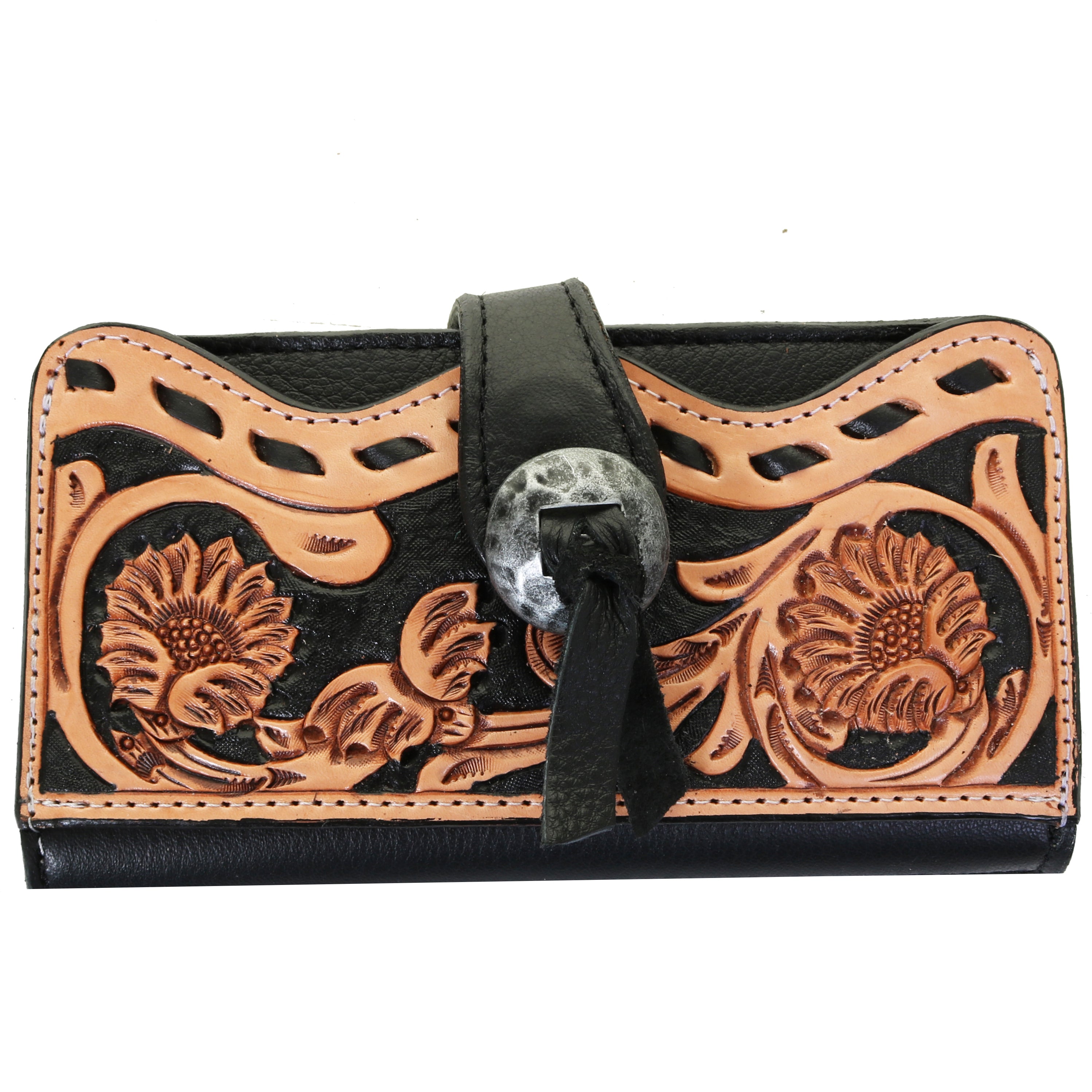 Ladies wallet in black leather with natural leather small sunflower tooled front pocket, black buckstitch, rockin' out buckle and black saddle string. The ladies' wallets have an open pouch in front, secured with a magnetic snap closure. There is a zippered pouch in back. The inside features: check book holder, credit card slots, photo holders, and a clear driver's license holder.
