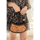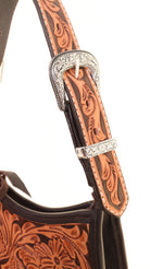 Sheridan Daisy tooling on natural leather. Chocolate Chap gusset and trim. 1 1/4" Adjustable Strap with Texas Whirlwind Brown Vintage Leather. Adjustable Buckle on each end.