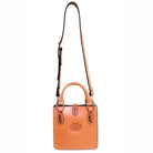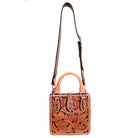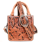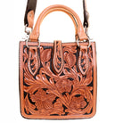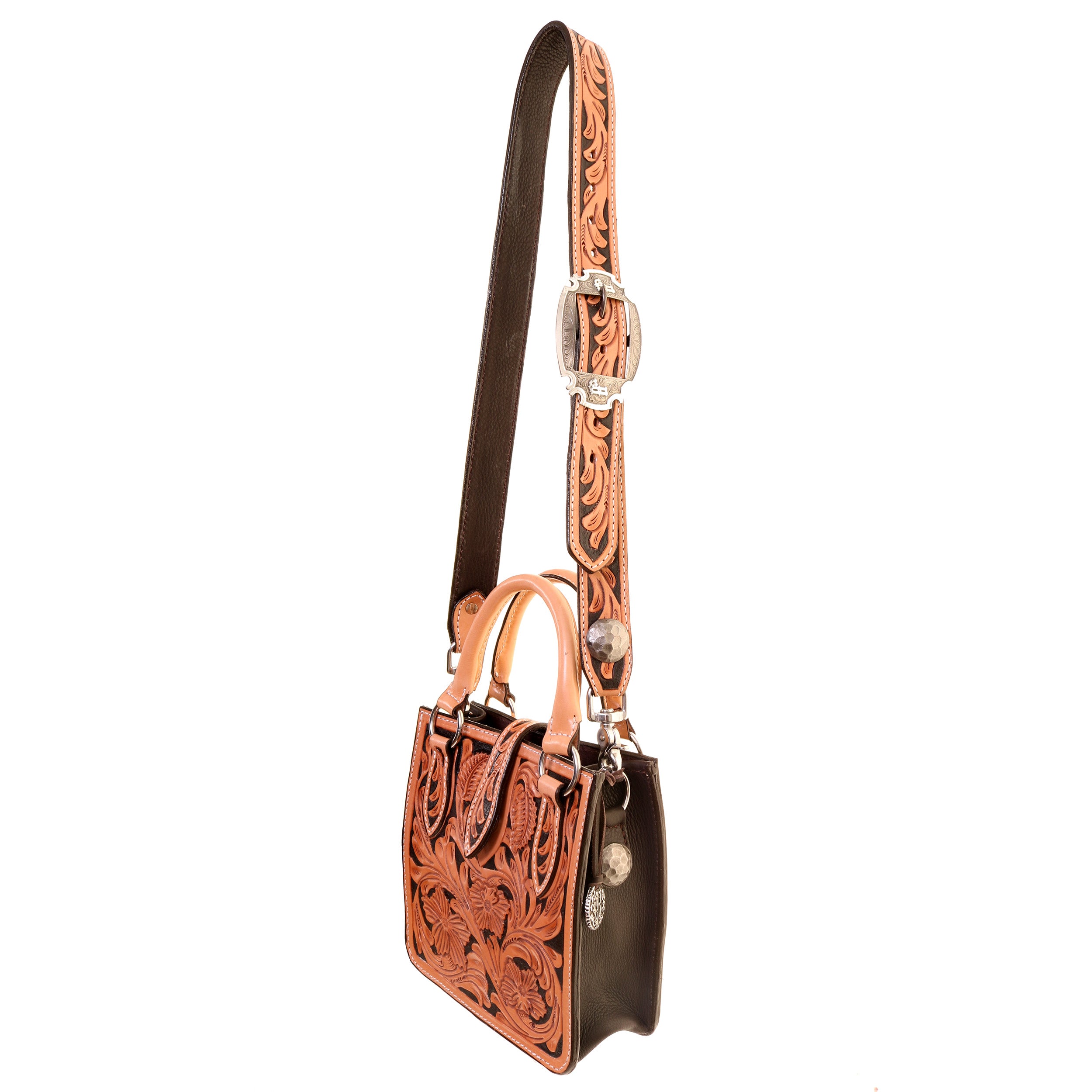 Sheridan Tooled Small Square Tote in Natural Leather with a Chocolate background. Double Handles and a adjustable long strap with our beautiful JJ buckle. Stitched in white stitching.