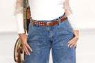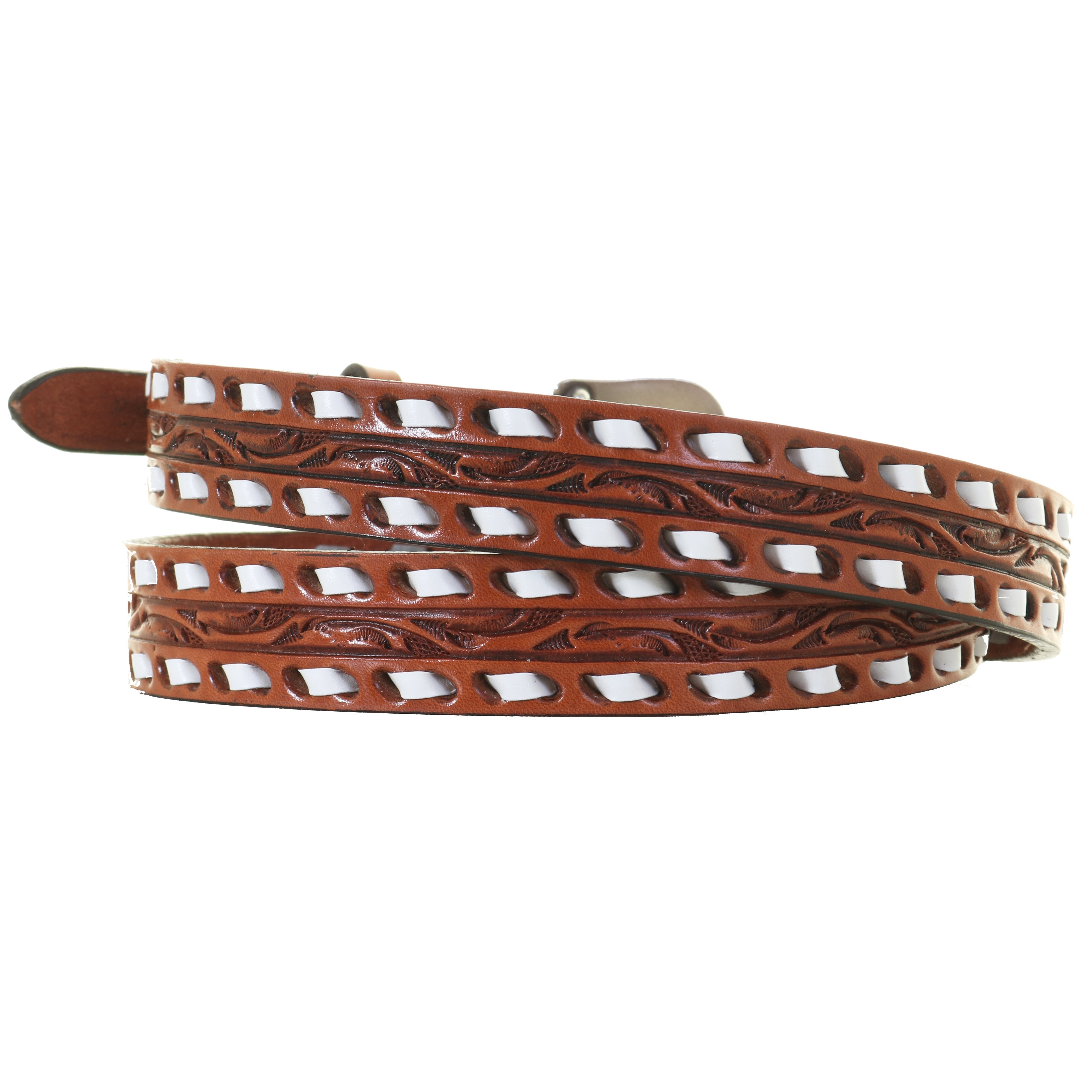 1" tapered to 3/4" chestnut tooled leather belt with white buck stitch along edges and a silver floral buckle set.