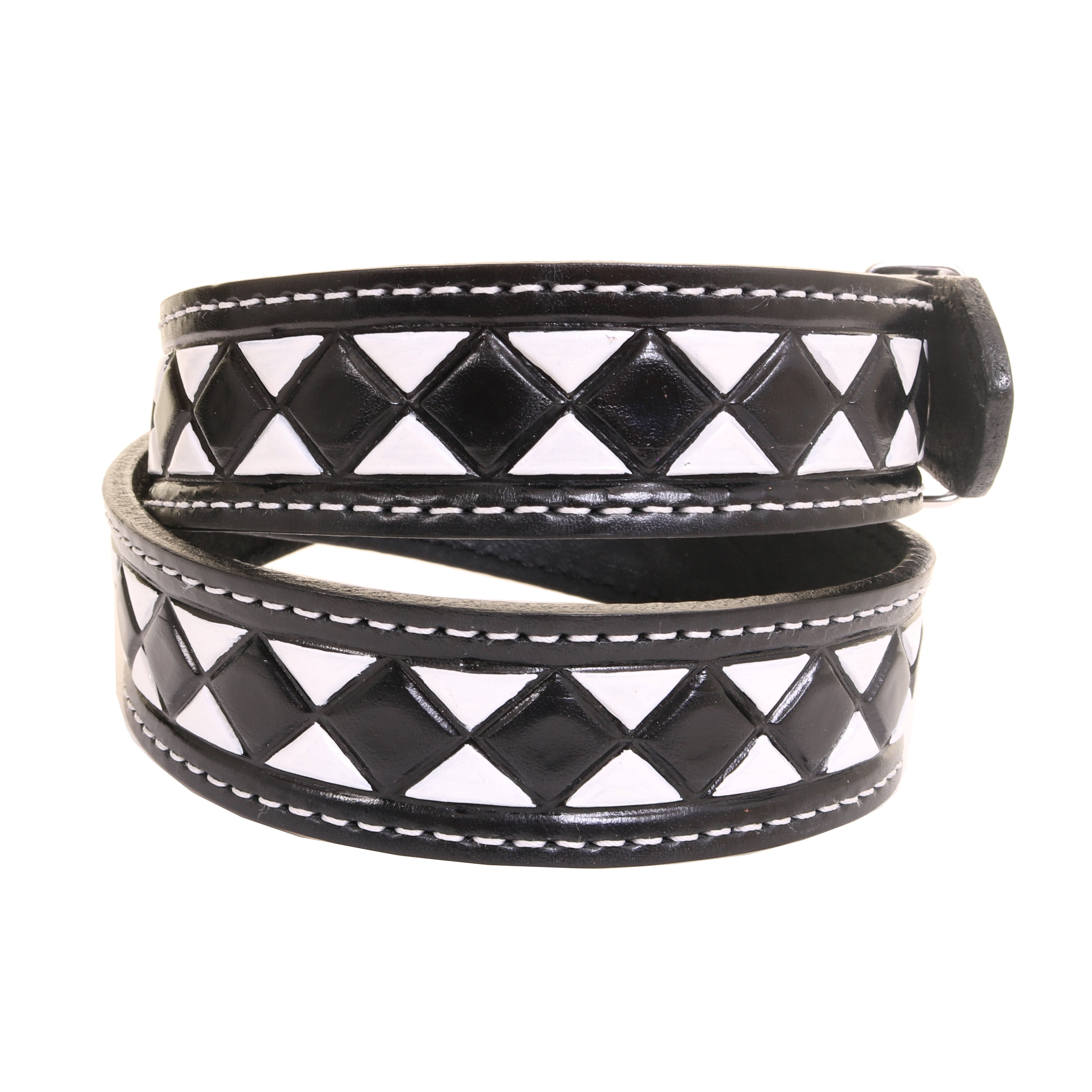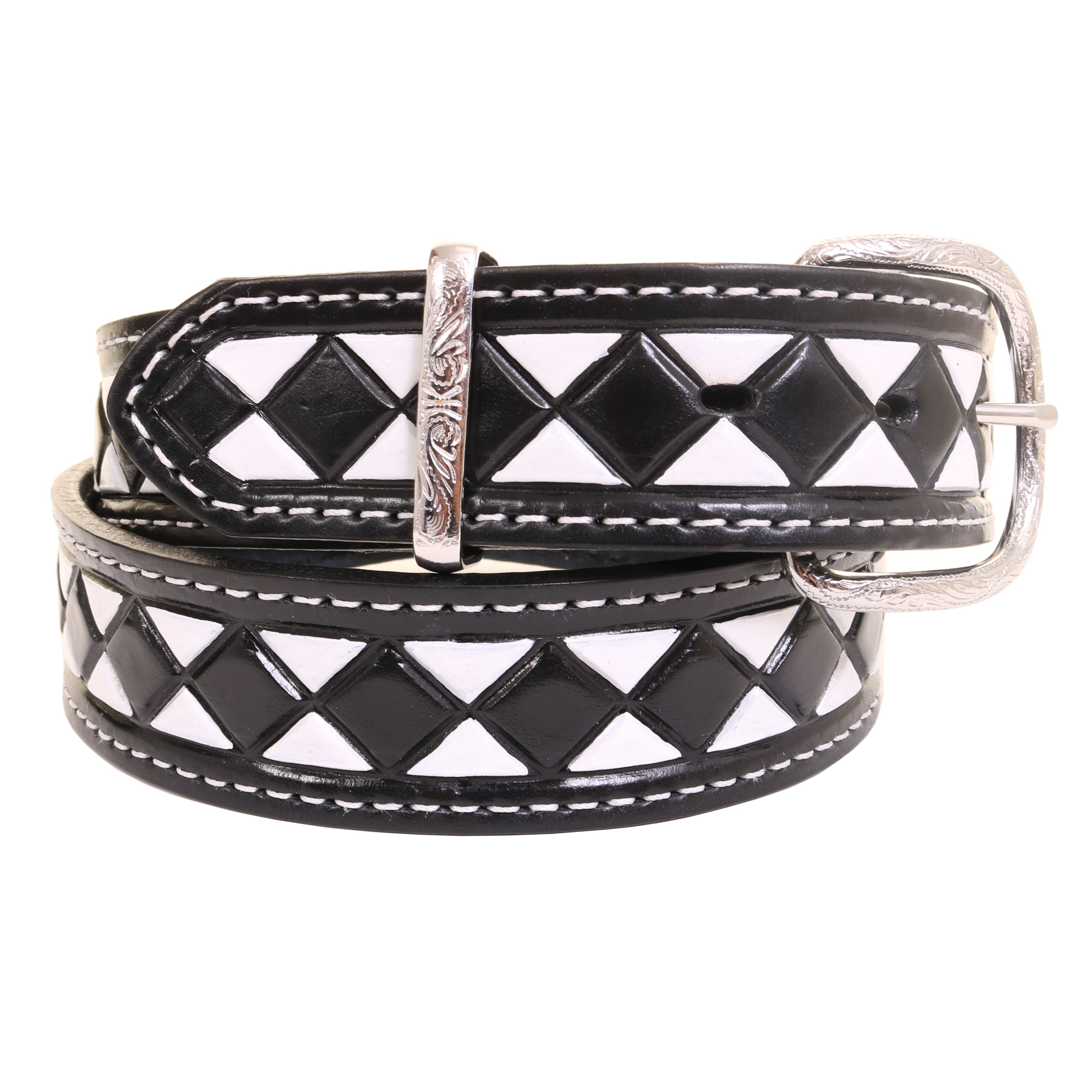 1 1/2" Straight Belt with Hand Tooled Checkered Pattern Down Center & Hand Painted Black & White with White Stitching