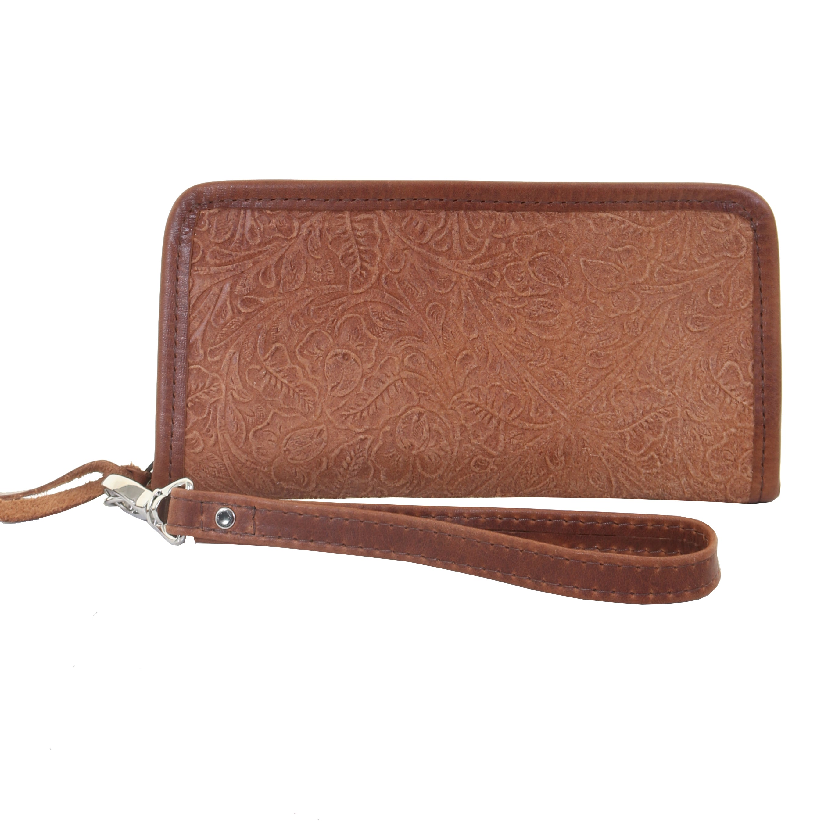 Ladies zipper wallet in western sotto tooled leather and brandy trim and wristlet.