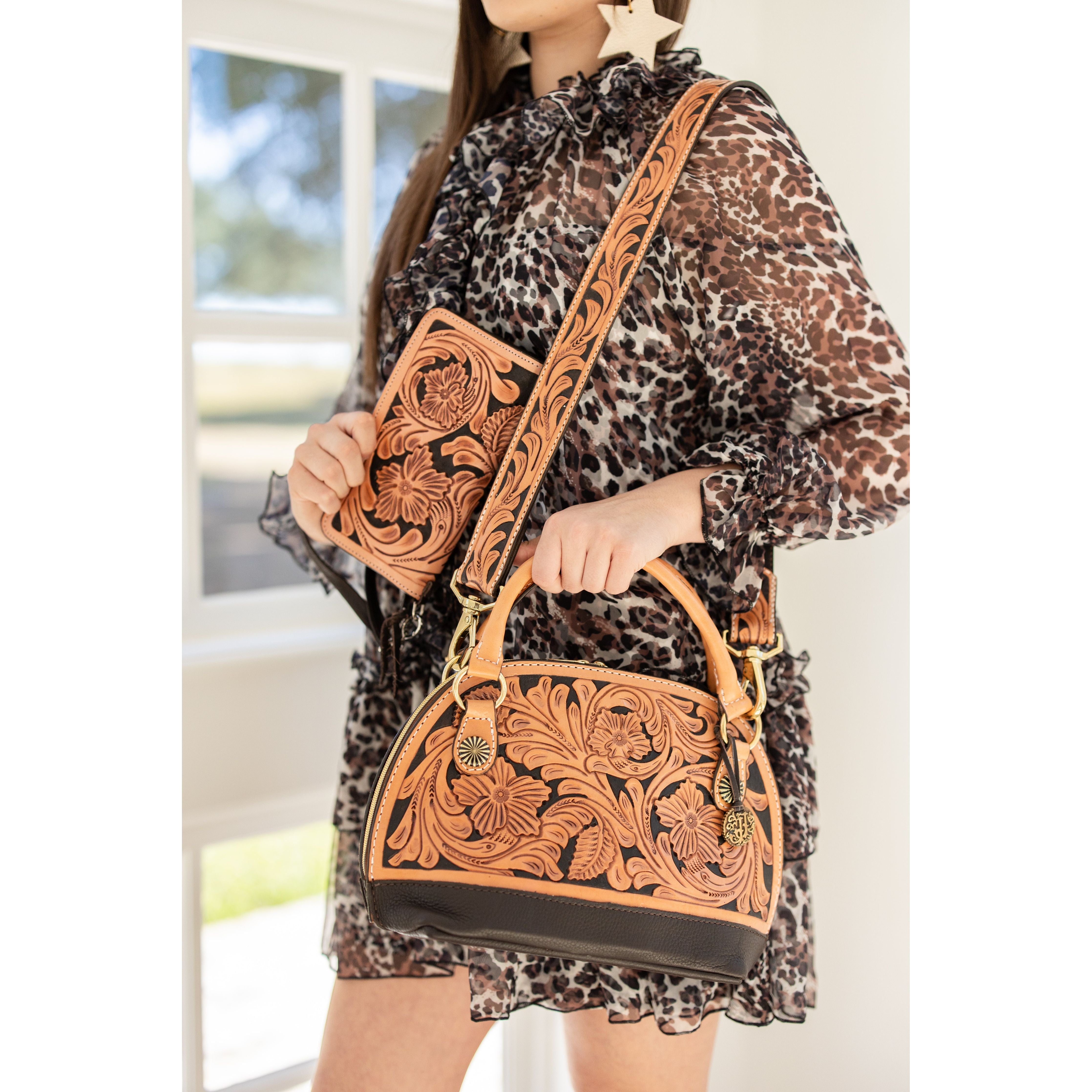 Ladies Zipper Wallet in Natural Leather with Sheridan Daisy Tooling on Front & Back with Chocolate Background. Included is a chocolate chap wristlet.