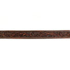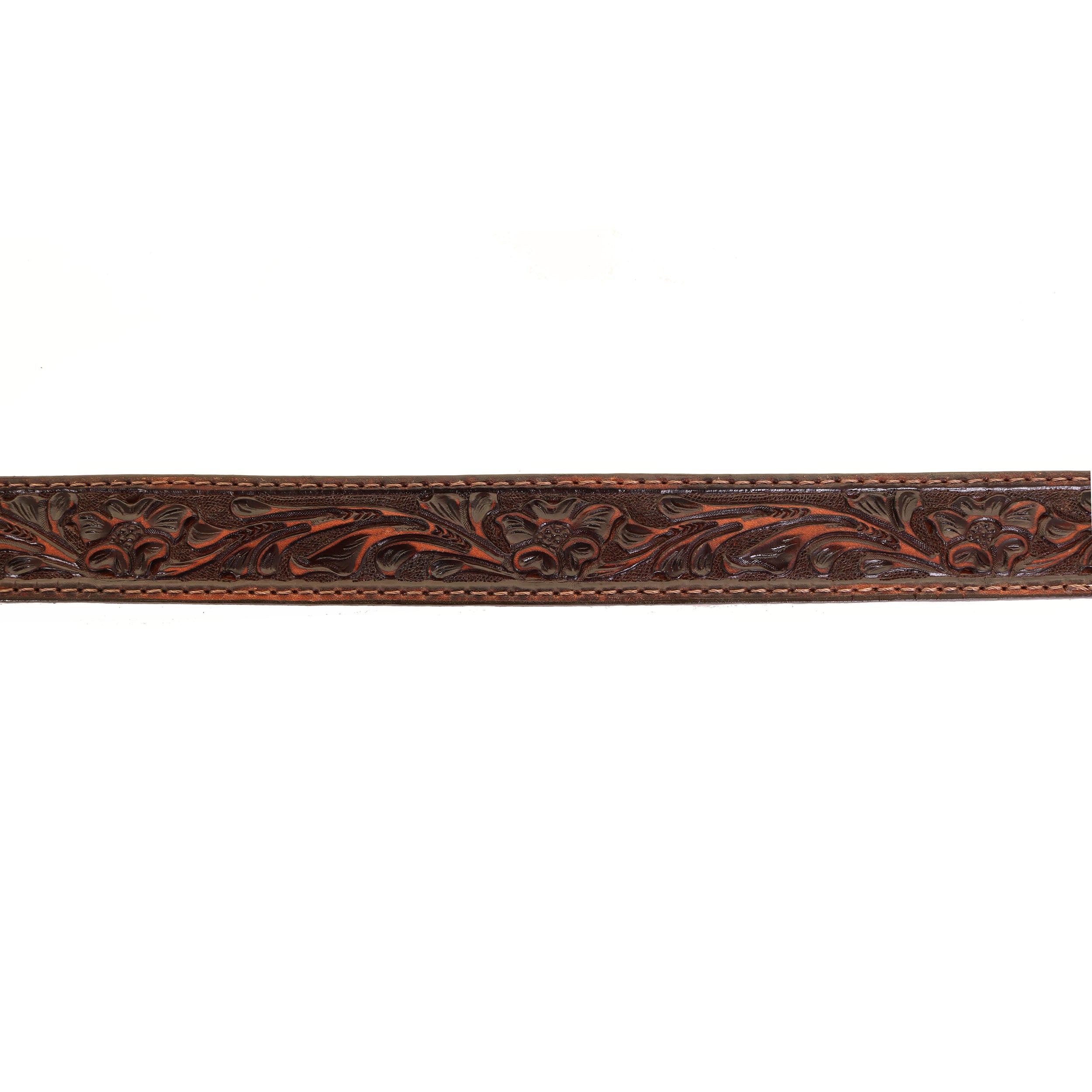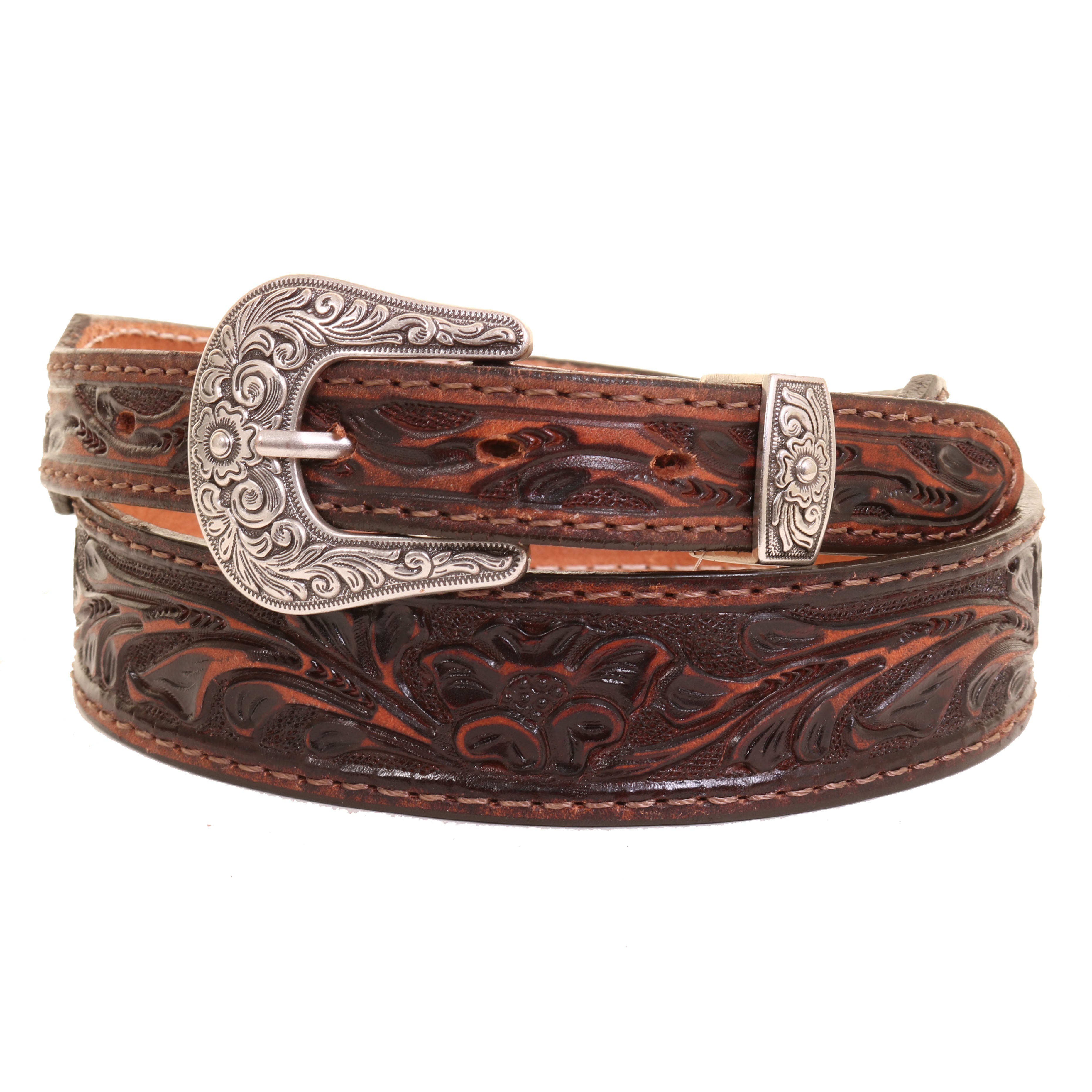 1-1/2" tapered to 1" brown vintage floral tooled belt with a single row of brown stitching. Accented with a silver engraved buckle and loop.