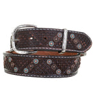 1-1/2" brown vintage belt with triangle diamond tool and and white stitching along edge. Mixed antique copper and antique copper patina rope edge dots in V design throughout belt.