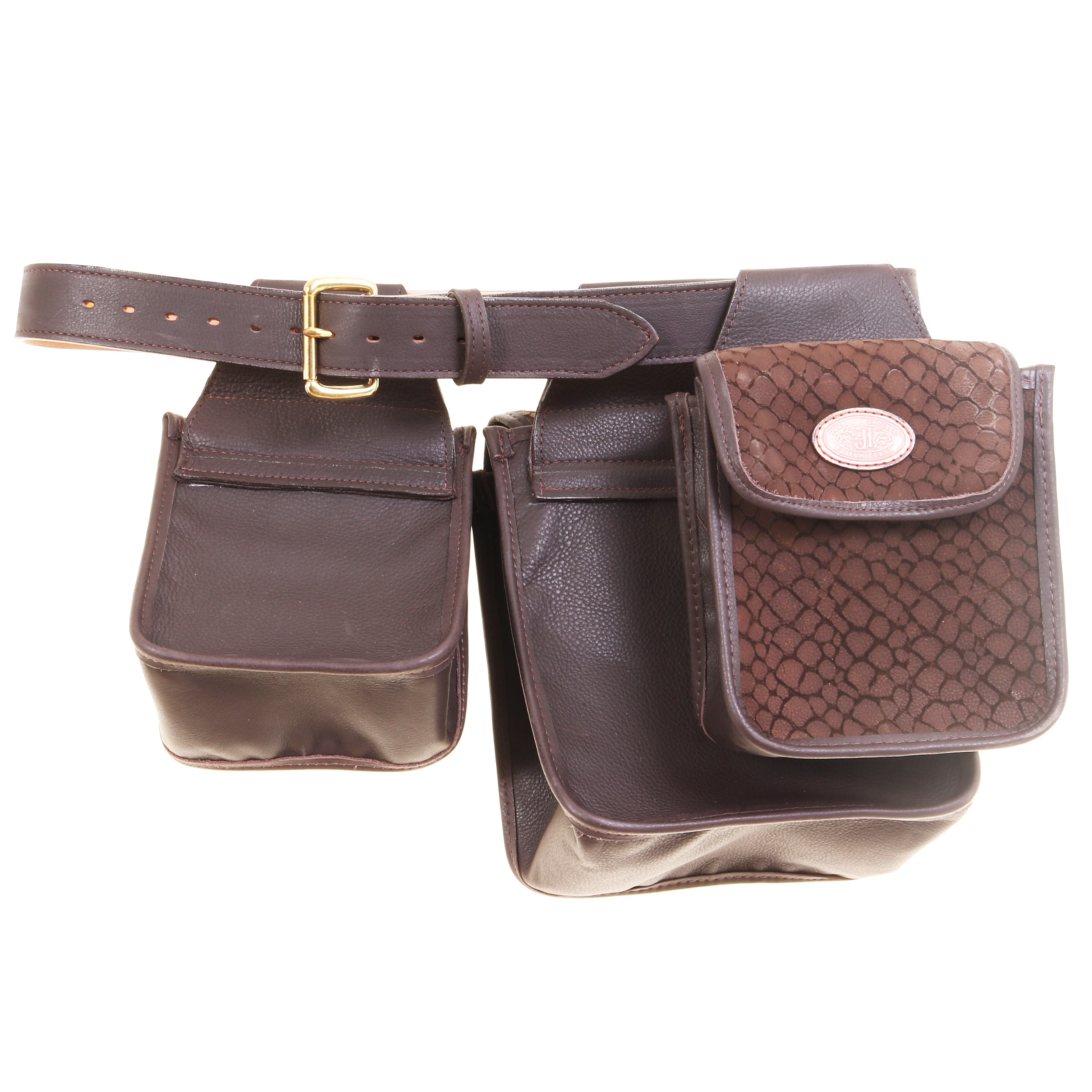 Brown suede gator print bird bag with chocolate chap trim and belt. Also comes with customizable initials plaque.