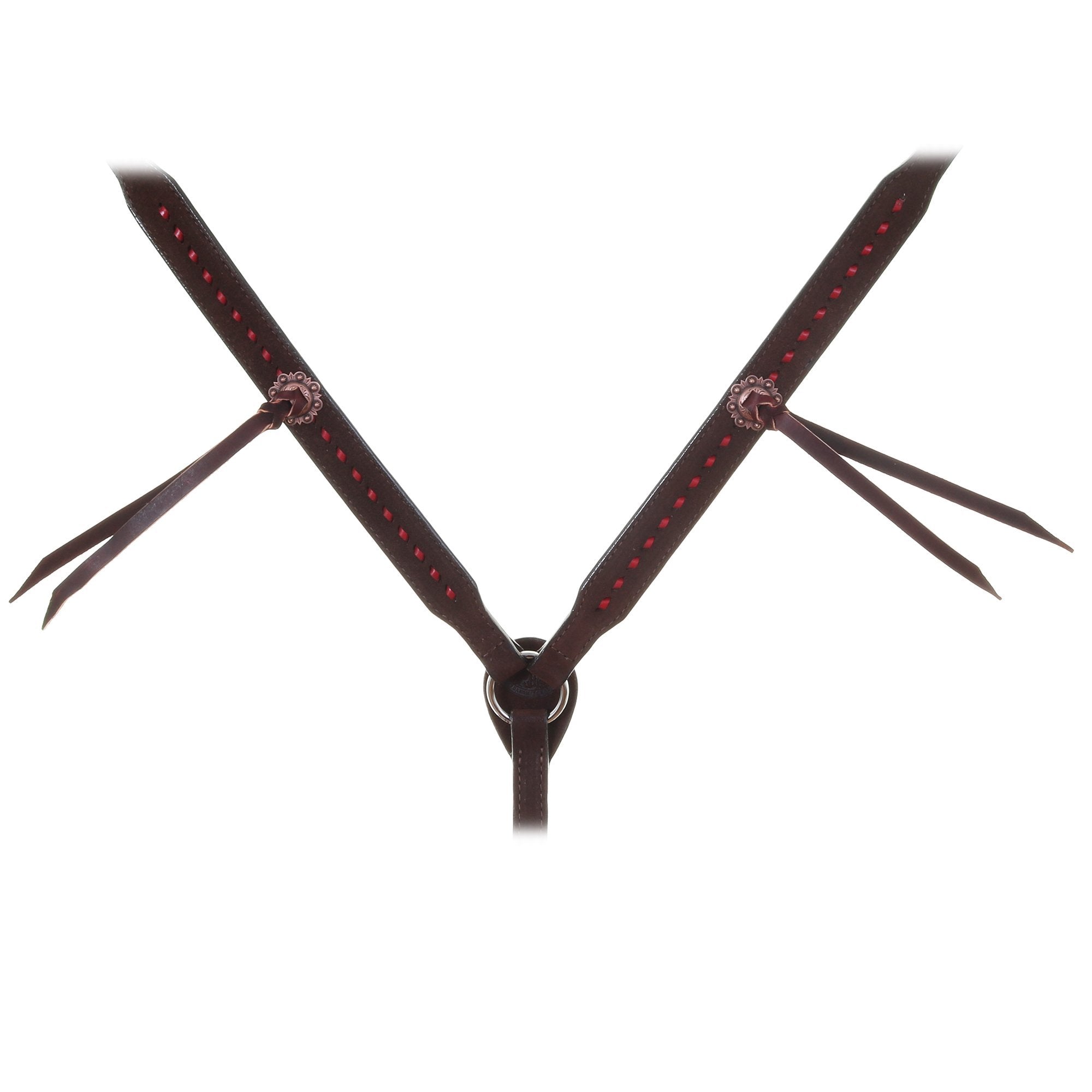 Brown rough out breast collar with red buck stitch down center, slotted antique copper berry conchos and latigo laces.