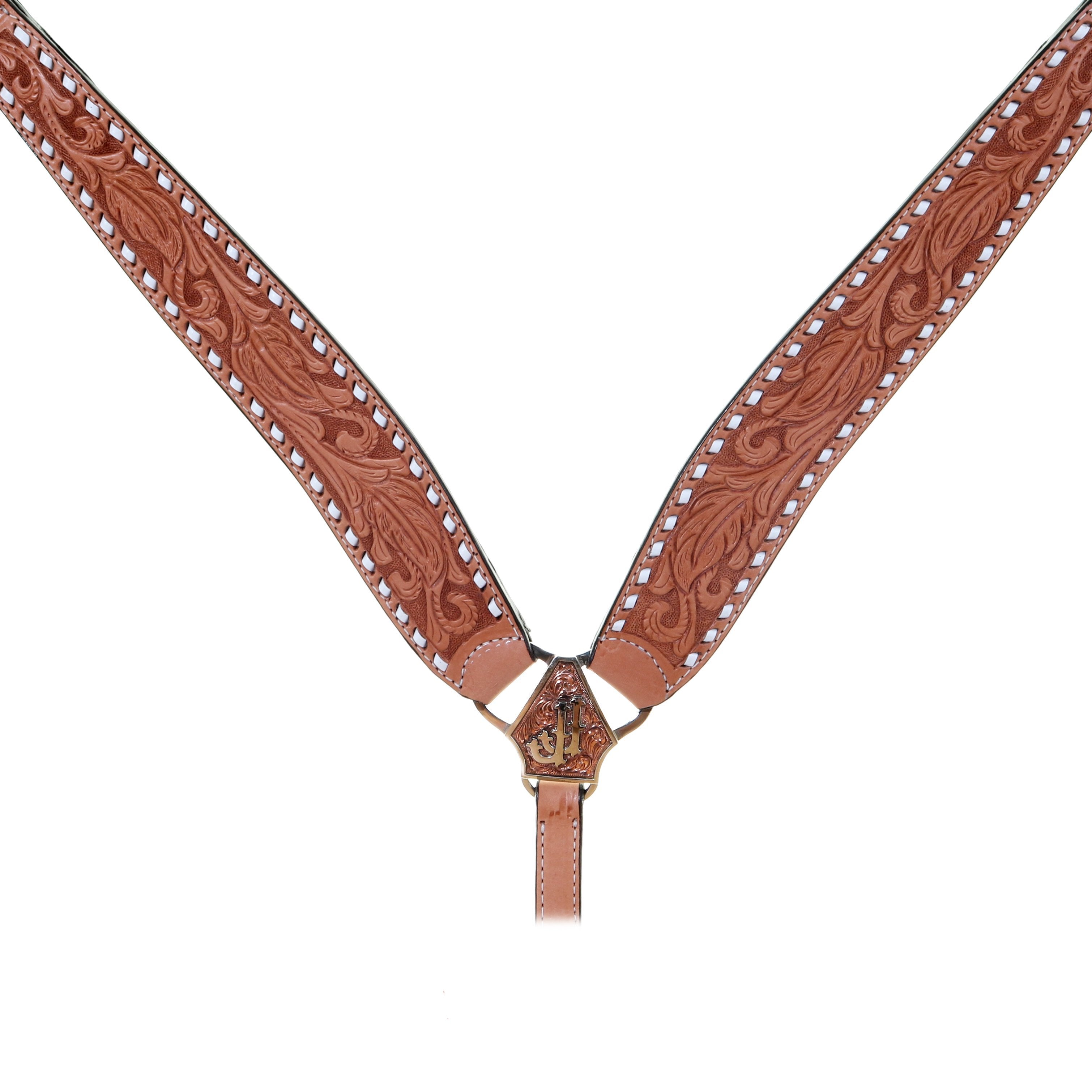 Natural leather breast collar with feather floral tooling with white buck stitch along edges. Copper and silver JJ 3 way center connector.