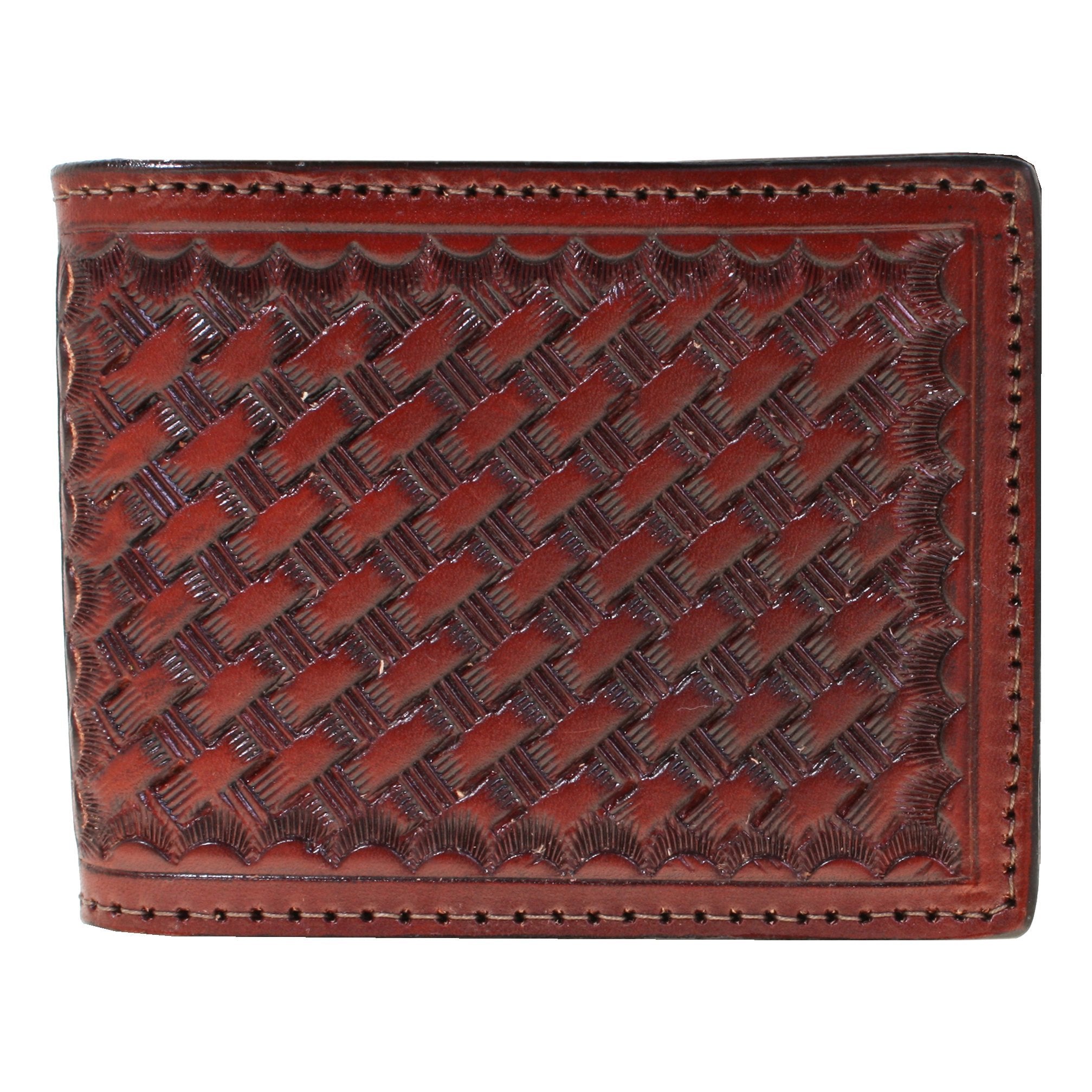 Cognac leather mens bifold wallet with basket weave tooling. Includes double sided picture window for driver's license or other I.D, 6 slots for credit cards, etc., 2 long dividers for cash, etc.
