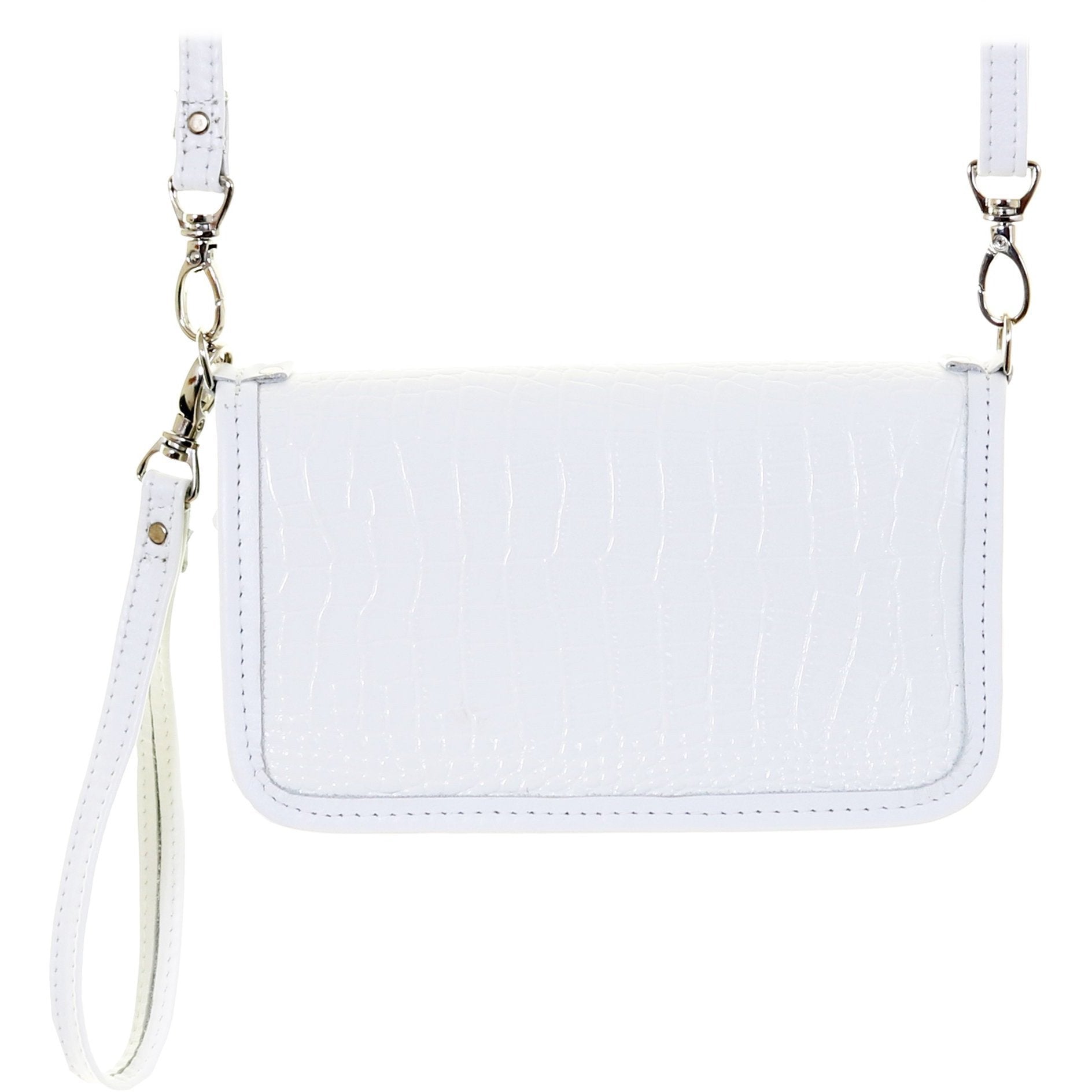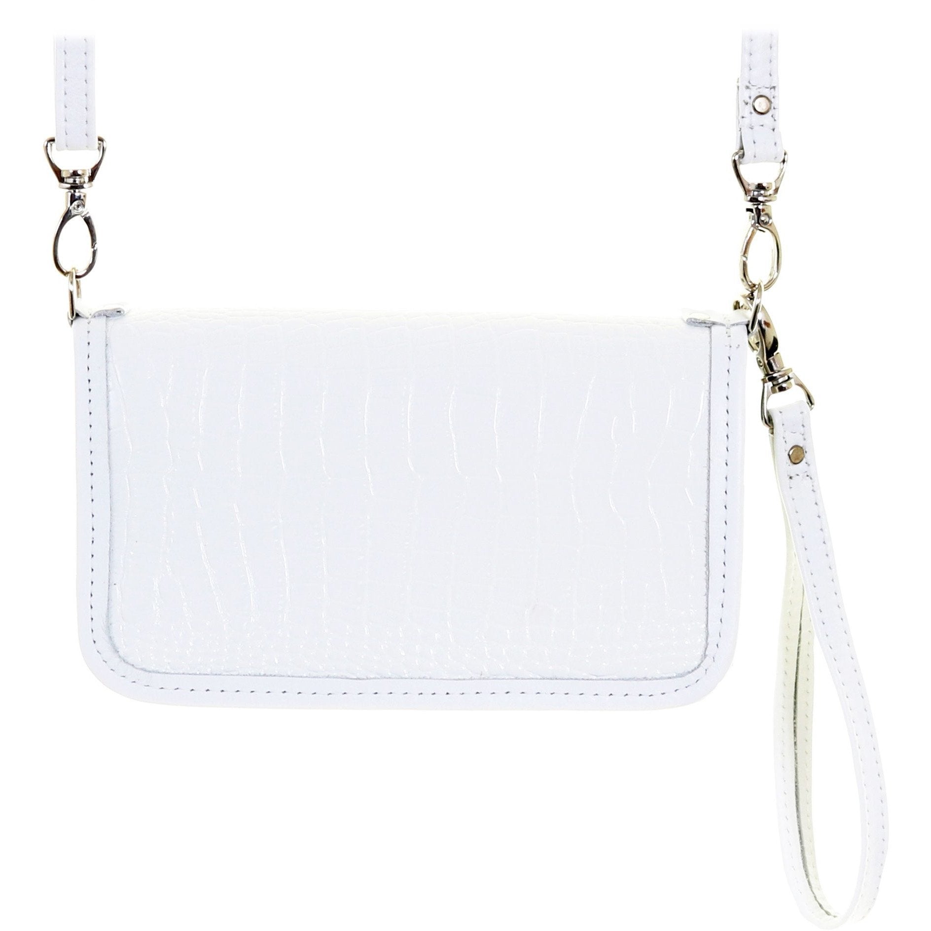 Clutch organizer in white gator print with white leather detachable long adjustable strap and wristlet. The inside features: check book holder, credit card slots, clear license holder, divided pockets and a zippered coin pouch.