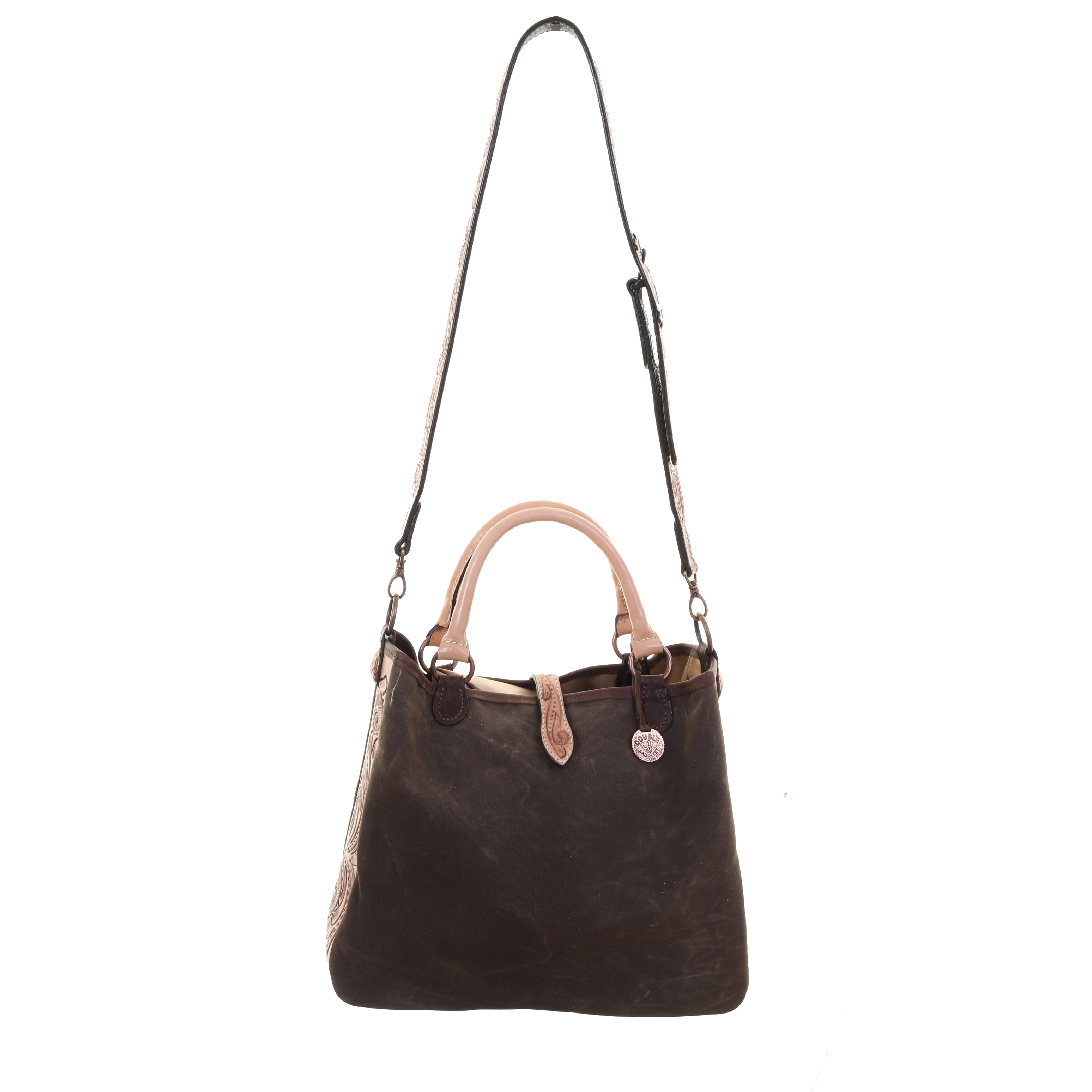 Canvas Tote in Brown Canvas with Natural Whirlwind Tooled Leather on Sides & Long Adjustable Natural Leather Strap with Whirlwind Tooling.