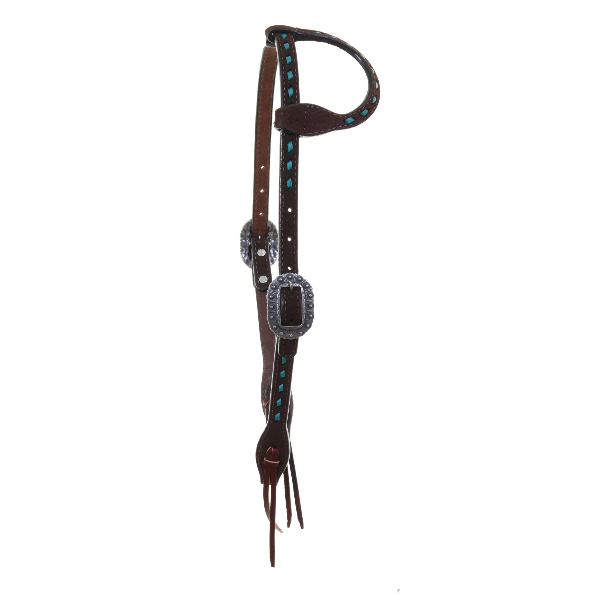 Brown roughout single ear headstall with turquoise buckstitch, Silver copper berry buckles, and laces at bit ends.