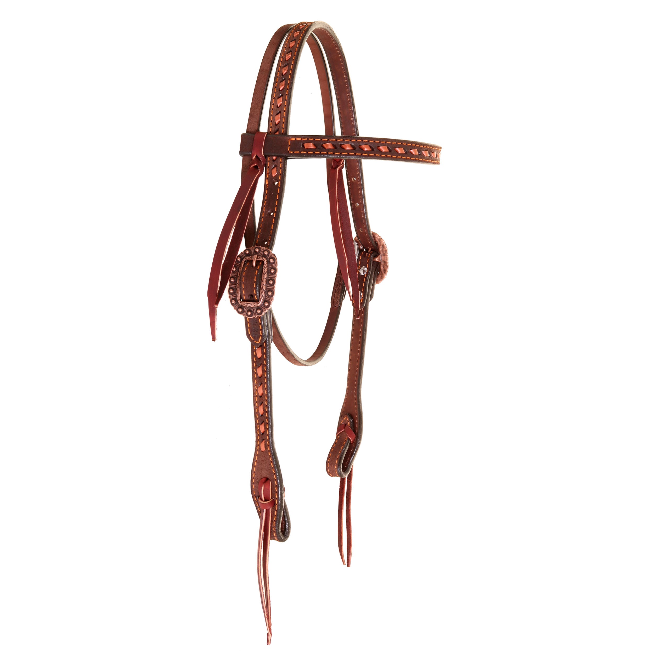 Brown roughout browband with copper buckstitch, copper thread, antique copper berry buckles, and laces at brow and bit ends.
