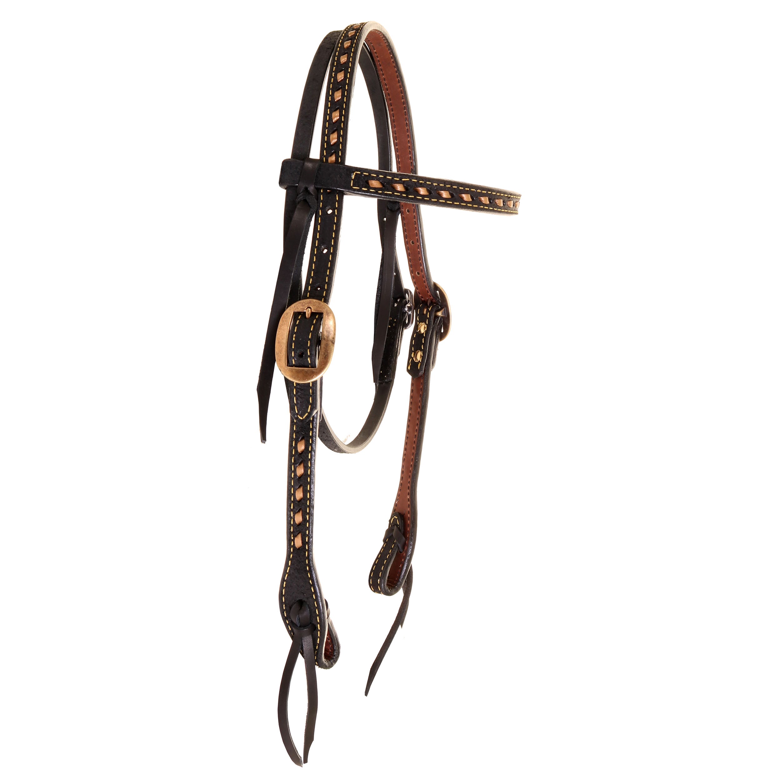 Black roughout browband with gold buckstitch, gold thread, antique brass buckles, and laces at bit ends and brow.