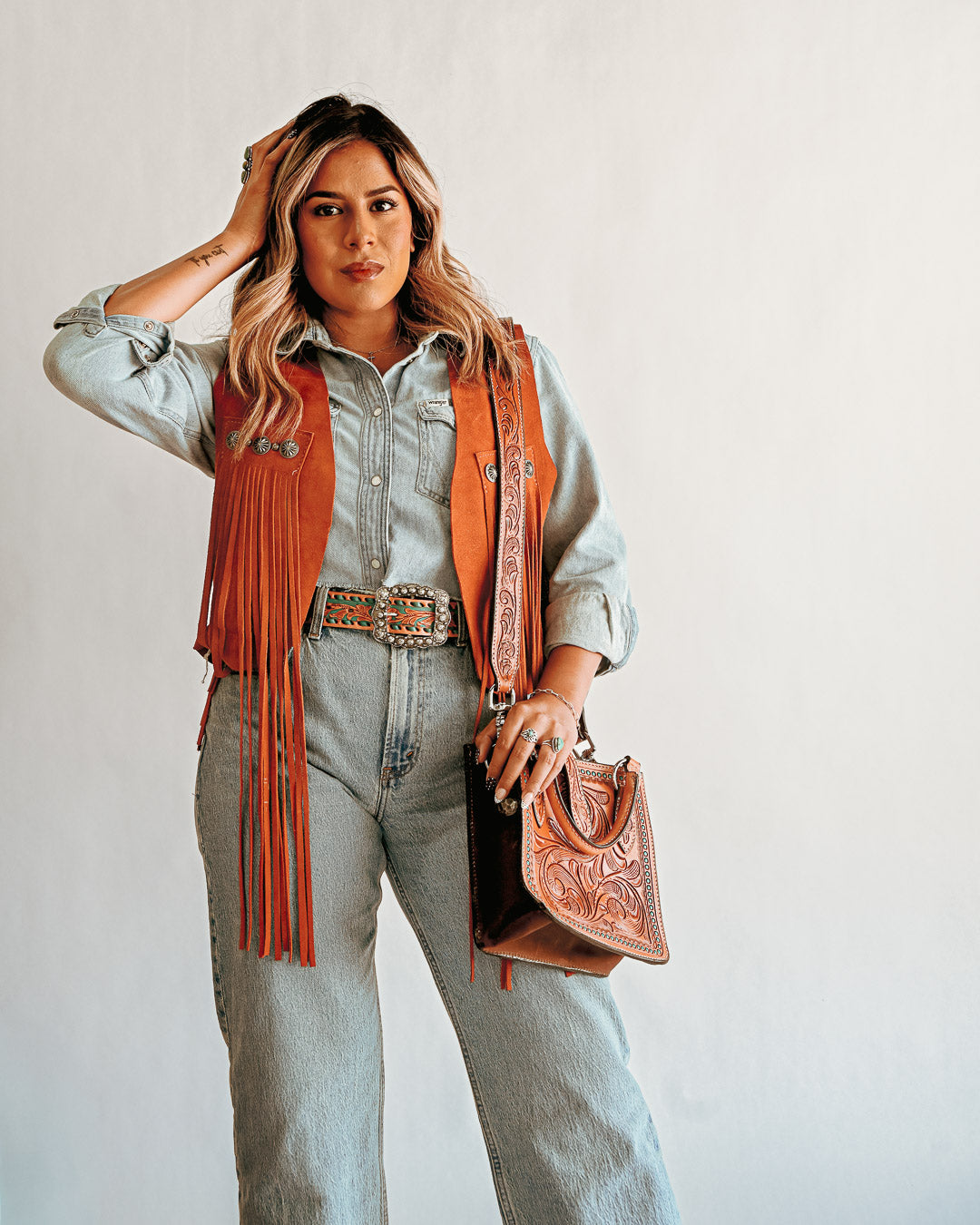 This vest is perfect for layering over your favorite shirts, dresses, or tees, making it a versatile addition to any wardrobe. Whether you're heading to a rodeo, festival, or simply channeling cowgirl chic, the Double J Fringe Vest is your go-to for statement style!