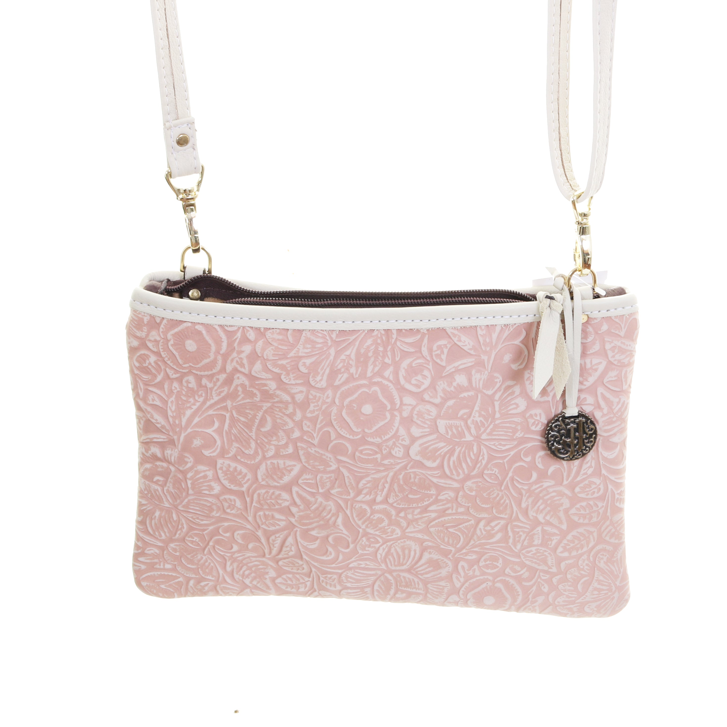 Medium clutch in blushing roses print on front and back. Eggshell trim and long adjustable strap. Also includes a top zipper closure and open pocket on back.