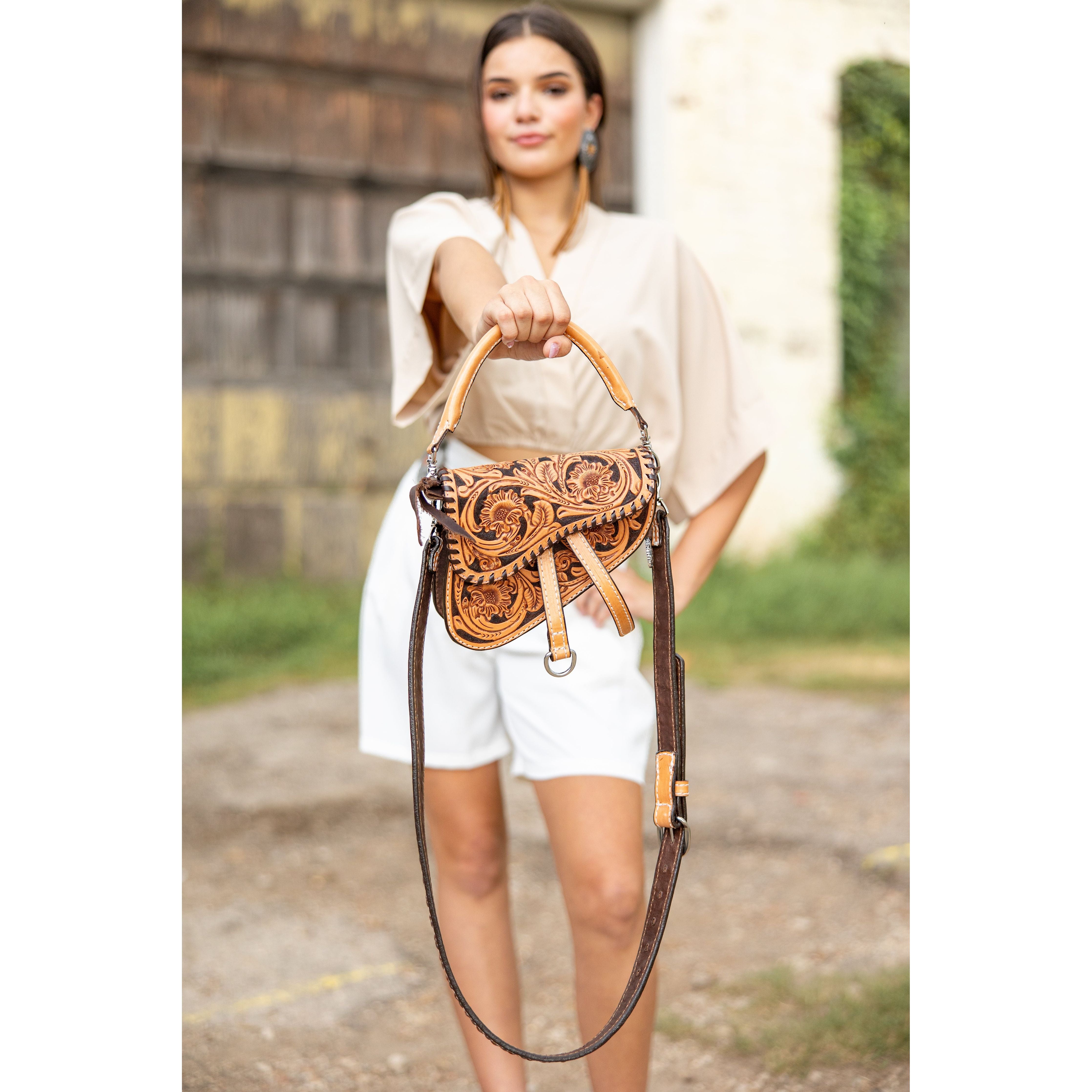 Saddle Purse in Natural Antiqued Leather with Tooled Roses & Painted Black Background. Black Chap Gusset & Rope Handle. 1" Tooled Strap with Black Buck Stitch. Strap & Handle are Both Removable.